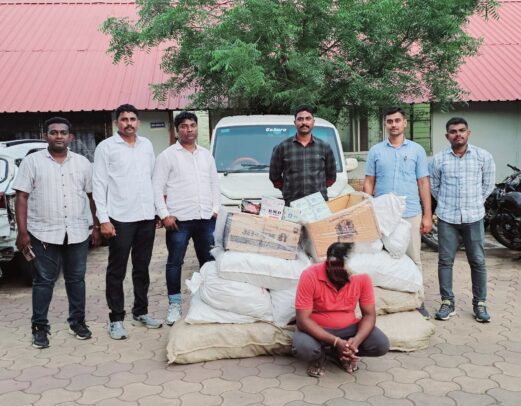 त्याचे गोडाऊन मधील मालाबाबत विचारपुस करता सुरुवातीस तो उडवा उडवीची उत्तरे देवु लागल्याने पंचा समक्ष त्याचे गोडाऊनची झडती घेतली असता सदर गोडाऊनमध्ये महाराष्ट्र राज्यात विक्रीस व वाहतुकीस प्रतिबंधीत तसेच शरीरास अपायकारक असलेला विविध प्रकारचा पानमसाला व गुटखा मिळुन आल्याने त्यास सदर पानमसाला व गुटखा कोणाचा आहे व तो कोठुन आणला या बाबत विचारपुस करता आरोपी रवी दळवी याने सदरचा माल त्याचा स्वत:चा आहे व पांडु ऊर्फ शकील तांबोळी (फरार) व शोएब शकील तांबोळी (फरार) दोन्ही (रा.करमाळा,जिल्हा सोलापुर) यांचे कडुन विक्रीस आणल्याचे सांगितल्याने.आरोपीस 1,30,680/- रुपये किंमतीचा विमल पानमसाला, 16,200/- रुपये किंमतीचा आरएमडी तंबाखु, 36,000/- रुपये किंमतीची आरएमडी सुपारी, 18,909/- रुपये किंमतीची विमल व्ही वन तंबाखु, 6,000/- रुपये किंमतीचा हिरा पानमसाला व 4,00,000/- रुपये किंमतीची टाटा सुमो गाडी असा एकुण 6,16,204/- रुपये किंमतीचे मुद्देमालासह ताब्यात घेवुन श्रीगोंदा पो.स्टे.गु.र.नं. 759/2024 भान्यासक 123,223, 274, 275, 3 (5) प्रमाणे गुन्हा दाखल करण्यात आला आहे.