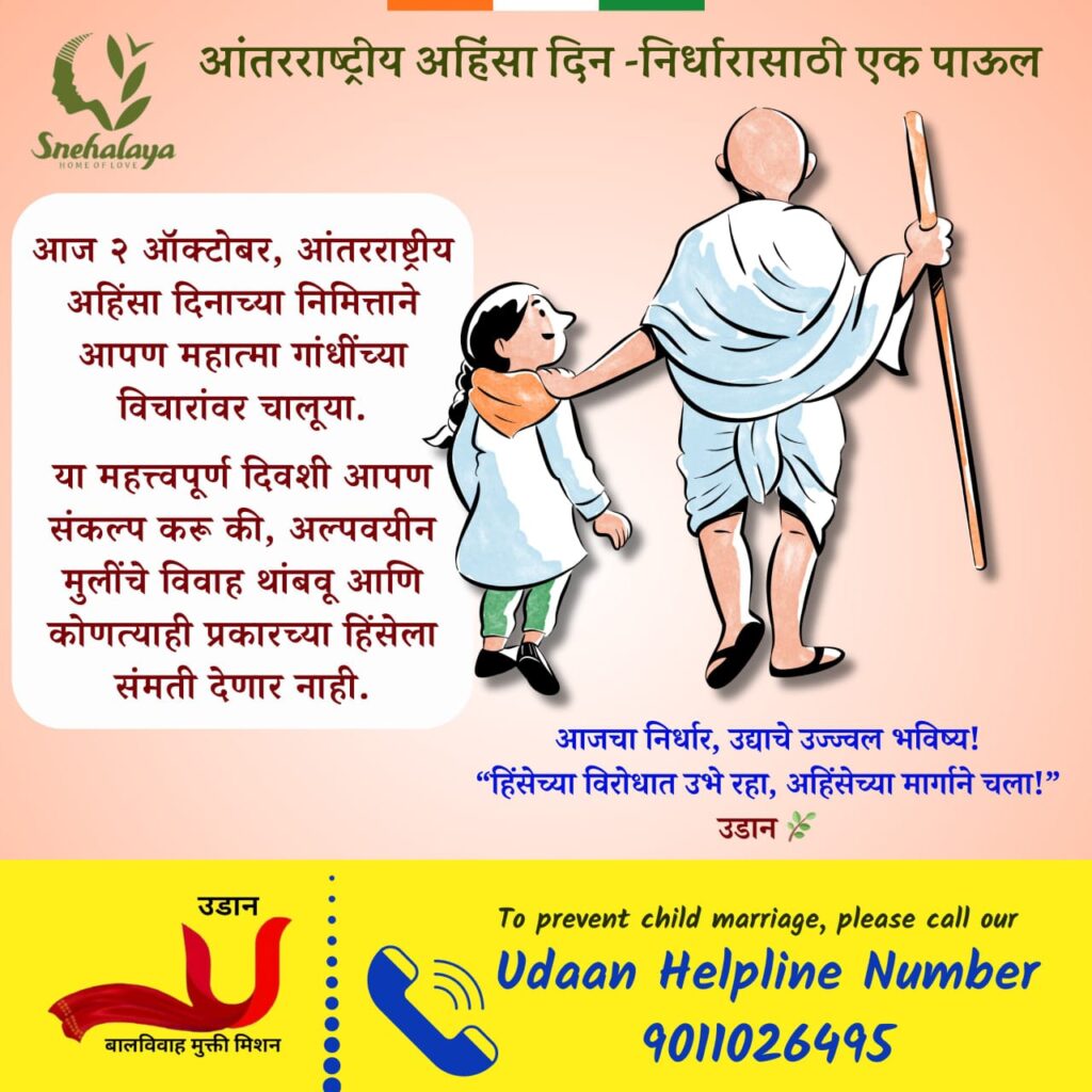 अहमदनगर (दि.१ ऑक्टो):-२ ऑक्टोबर,आंतरराष्ट्रीय अहिंसा दिनाच्या निमित्ताने आपण महात्मा गांधींच्या विचारांवर चालूया… अहिंसेच्या या महत्त्वपूर्ण दिवशी आपण संकल्प करू की,अल्पवयीन मुलींचे बालविवाह थांबवू आणि कोणत्याही प्रकारच्या हिंसेला संमती देणार नाही.