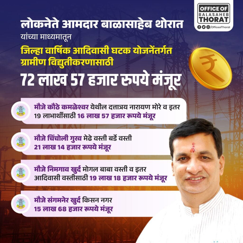 संगमनेर (तालुका प्रतिनिधी/राजेंद्र मेढे):-काँग्रेस विधिमंडळ पक्षनेते आमदार बाळासाहेब थोरात यांच्या माध्यमातून जिल्हा वार्षिक आदिवासी घटक योजनेंतर्गत ग्रामीण विद्युतीकरणासाठी 72 लाख 57 हजार रुपये मंजूर..