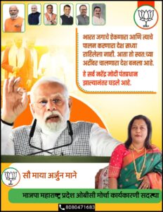 माढा तालुक्यात महिलांसाठी वेगवेगळे उपक्रम राबवून व तसेच महिलांवर होणाऱ्या अत्याचाराविरुद्ध आवाज उठविणाऱ्या सौ.माया माने यांची महिला मोर्चा अध्यक्षपदी निवड झाल्याने तालुक्यात आनंदाचे वातावरण निर्माण झाले आहे.