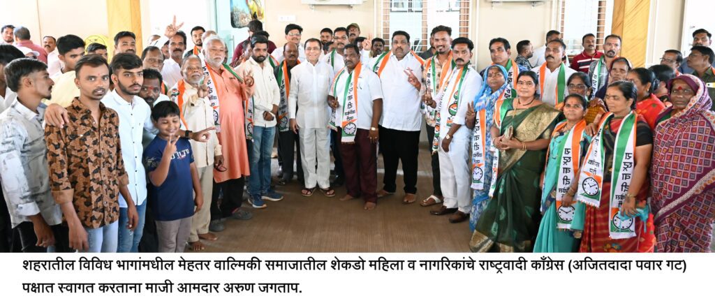 अहिल्यानगर:-शहराचे आमदार संग्राम जगताप यांच्या नेतृत्वाखाली शहरातील नालेगाव,भिंगार,वसंत टेकडी,सिद्धार्थनगर,सावेडी, पाईपलाईन रोडसह विविध भागांमधील वाल्मिकी मेहतर समाजातील शेकडो महिला व नागरिकांनी आज राष्ट्रवादी काँग्रेस (अजितदादा पवार गट) पक्षात मध्ये प्रवेश केला.माजी आमदार अरुण जगताप यांनी पक्षाचे उपरणे घालून सर्वांचे पक्षात स्वागत केले.यावेळी विश्वास जुना…संग्राम भैय्या पुन्हा… अशा घोषणा देण्यात आल्या.