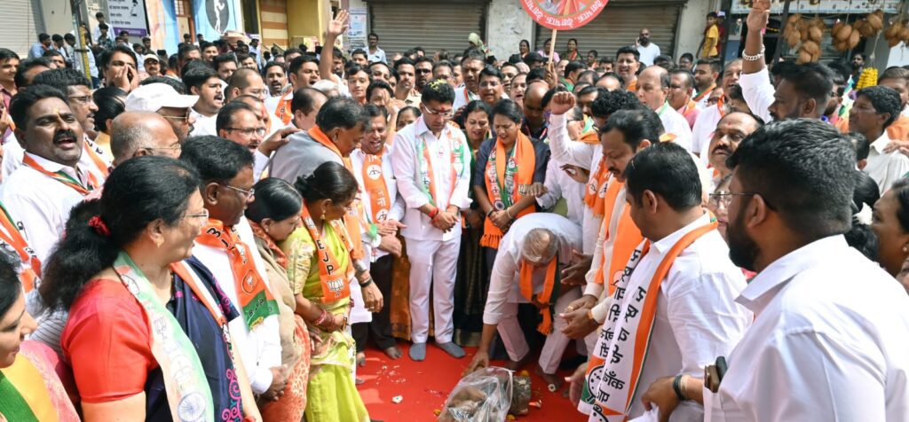 महायुतीचे उमेदवार आमदार संग्राम जगताप यांच्या प्रचाराचा शुभारंभ शनिवारी सकाळी शहराचे ग्रामदैवत श्री विशाल गणेश मंदिरात विधिवत पूजा करून करण्यात आला.माजी आमदार अरुण जगताप,भाजपाचे शहर जिल्हाध्यक्ष अभय आगरकर, शिवसेनेचे जिल्हाप्रमुख अनिल शिंदे, राष्ट्रवादीचे शहर जिल्हाध्यक्ष संपत बारस्कर, आरपीआयचे शहराध्यक्ष किरण दाभाडे, भाजपाचे शहर विधानसभा प्रमुख महेंद्र गंधे आदींसह प्रमुख पदाधिकाऱ्यांच्या हस्ते नारळ फोडून प्रचाराचा शुभारंभ करण्यात आला. तत्पूर्वी छत्रपती शिवाजी महाराजांच्या पुतळा, भारतरत्न डॉ. बाबासाहेब आंबेडकर, महात्मा ज्योतिबा फुले आदी महापुरुषांच्या पुतळ्यास आमदार संग्राम जगताप यांनी अभिवादन केले. छत्रपती शिवाजी महाराजांच्या पुतळ्यापासून मोठे शक्ती प्रदर्शन करत प्रचार फेरी काढण्यात आली . यावेळी ठिकठिकाणी मोठे पुष्पहार व जेसीबीतून पुष्पृष्टी करून व फटाक्यांची आतषबाजी करून’ प्रचार फेरीचे जल्लोषात स्वागत करण्यात आले. नागरिकांना अभिवादन करत संग्राम जगताप प्रचार फेरीत चालत होते. यावेळी माळीवाडा परिसरात यावेळी मोठी गर्दी झाली होती.