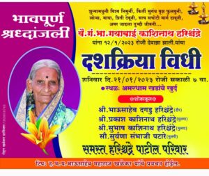 राहुरी प्रतिनिधी(निधन वार्ता):-खडांबे खु येथील माजी सरपंच कै.काशिनाथ दगडू पाटील हरिश्चंद्रे यांच्या पत्नी तसेच श्री.प्रकाश व सुभाष काशिनाथ पाटील हरिश्चंद्रे यांच्या मातोश्री गं.भा.गयाबाई काशिनाथ हरिश्चंद्रे यांचे गुरुवार दिनांक १२/०१/२०२३ रोजी दुखद निधन झाले होते.त्यांचा दशक्रिया विधी शनिवार दिनांक २१/०१/२०२३ रोजी सकाळी ठिक ७:०० वाजता खडांबे खुर्द आमरधाम येथे होईल.त्यांच्या पश्चात दोन मुल,एक मुलगी,जावई सूना,नातवंडे,पुतणे,जावा, दीर असा मोठा परिवार आहे.पत्रकार दिपक हरिश्चंद्रे यांच्या त्या आज्जी होत.