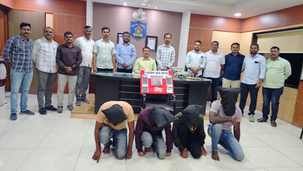 त्यानुसार पथकाने अभिषेक महेश तळेगावकर याचा शोध घेऊन,तपास करून त्याने सदरचे सोने सोमवार पेठ,पुणे येथील सोनाराकडे विकल्याची माहिती दिली.तपास पथकाने पंचासमक्ष सोमवार पेठ,पुणे येथील सोनाराकडून 15,03,425/- रूपये किंमतीचा ( 195.250 ग्रॅम वजनाची सोन्याची लगड ) मुद्देमाल जप्त करण्यात आलेला आहे. गुन्हयाचे तपासात निष्पन्न आरोपी मनोज साठे बेलवंडी फाटा येथे असलेबाबत मिळालेल्या माहितीवरून पथकाने बेलवंडी फाटा, ता.श्रीगोंदा येथे सापळा रचुन संशयीताचा शोध घेऊन त्यांना ताब्यात घेतले.ताब्यात घेण्यात आलेल्या इसमांना पोलीस पथकाची ओळख सांगुन त्यांचे नाव गांव विचारले असता त्यांनी त्यांचे नाव 1)दयावान उर्फ मनोज बाळासाहेब साठे, वय 25, रा.गोरडवाडी, ता.माळशिरस, जि.सोलापूर 2)अजय उर्फ भोऱ्या उर्फ भोल्या बाळु देवकर,वय 22, रा.कौठेयमाई, ता.शिरूर,जि.पुणे 3) योगेश अंकुश कडाळे, वय 27,रा.धामणी, लोणी, ता.आंबेगाव, जि.पुणे व 4)आकाश ठकाराम दंडवते, वय 28,रा.मलठण, ता.शिरूर,जि.पुणे असे सांगीतले.ताब्यातील आरोपीकडून 92,000/- रूपये किंमतीचा मुद्देमाल त्यात अजय उर्फ भोल्या बाळु देवकर याचे ताब्यातुन 30,000/- रू किंमतीचे गावठी पिस्तुल व 2,000/- रू किं.2 जिवंत काडतुस व आरोपीकडून प्रत्येकी 1 मोबाईल असा मुद्देमाल हस्तगत करण्यात आला आहे.ताब्यात घेण्यात आलेल्या आरोपीकडे वर नमूद गुन्हयांचे अनुषंगाने विचारपुस करता, त्यांनी सदरचा गुन्हा 5)धोंडया महादु जाधव (फरार) व 6 )मन्ना उर्फ सुरजसिंग उर्फ अजयसिंग, रा.पंजाब (फरार) अशांनी केला असल्याची माहिती दिली.तपास पथकाने ताब्यात आरोपीतांना विश्वासात घेऊन विचारपूस केली असता आरोपी नामे धोंडया महादु जाधव (फरार) याने वरील सर्व आरोपीतांना एकत्रित करून नमूद गुन्हयांचा प्लॉन तयार केलेला आहे.त्यासाठी आरोपी हे दिवाळी सणाच्या वेळी स्विप्ट गाडीमध्ये साकुर,ता.संगमनेर येथे येऊन कान्हा ज्वेलर्स पाहणी केली.