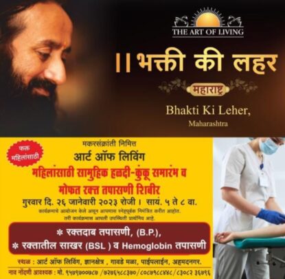 नगर प्रतिनिधी (दि.२० जानेवारी):-मकर संक्रांतीनिमित्त आर्ट ऑफ लिविंग तर्फे महिलांसाठी सामूहिक हळदीकुंकू समारंभ व मोफत रक्त तपासणी शिबिर गुरुवार दि.२६ जानेवारी रोजी सायंकाळी ५ ते ८ वाजता आर्ट ऑफ लिविंग ज्ञानक्षेत्र गावडे मळा पाईपलाईनरोड अहमदनगर येथे आयोजित केलेला आहे तरी शहरातील व तसेच परिसरातील महिलांनी या कार्यक्रमास उपस्थित राहावे असे आवाहन आयोजकांच्या वतीने करण्यात आले आहे.विशेष सामूहिक हळदी कुंकु जसे प्रत्येक स्त्री आपल्या दिर्घ सौभाग्याची प्रार्थना देवाकडे करते,पतीला निरोगी आरोग्य आणि दिर्घ आनंदी आयुष्य मागत असते.प्रत्येक सौभाग्याचा सण श्रद्धेने साजरा करते.पण प्रत्येक स्त्रीयांचे आरोग्याची काळजी घेण्यासाठी,तिच्या दिर्घायुष्यासाठी,आनंदासाठी विचार करणे तेवढेच महत्त्वाचे आहे.कारण ती कुटुंबाची मध्य बिंदू आहे,एक उर्जा स्त्रोत आहे,तीच्या दिर्घ आयुष्यासाठी,निरोगी आरोग्यासाठी अहमदनगर आर्ट ऑफ लिव्हिंग घेऊन आला आहे.महिला स्पेशल मोफत आरोग्य,आणि रक्ततपासणी शिबिर व संक्रांती स्पेशल विशेष सामुहिक हळदीकुंकू कार्यक्रम तरी सर्व महिलांनी ह्या कार्यक्रमात सहभागी व्हावे.आणि खालील Group ला join करावे.👇