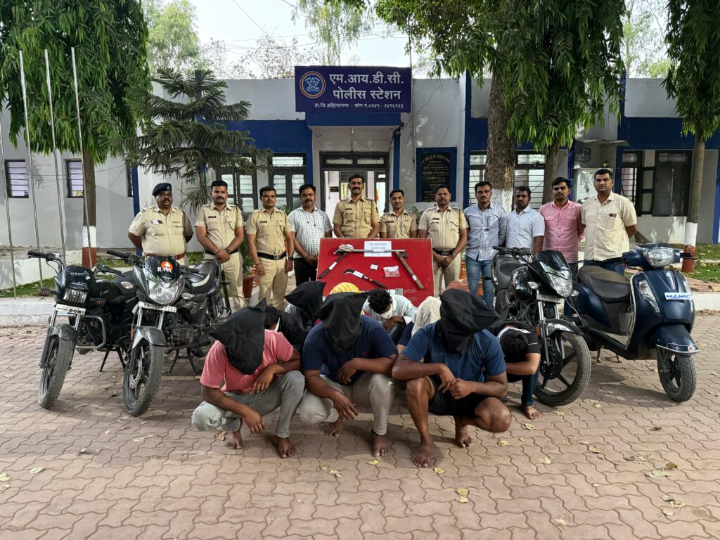 पकडलेल्या इसमांची अंगझडती घेतली असता त्यांच्या ताब्यातून लोखंडी कोयता लोखंडी पाईप लोखंडी कुऱ्हाड दोरी मिरचीची पूड लाकडी दांडके चार मोटारसायकली नऊ मोबाईल असा मुद्देमाल जप्त करण्यात आला.पोलीस अंमलदार किशोर सुभाष जाधव यांच्या फिर्यादीवरून एमआयडीसी पोलीस ठाण्यात गुन्हा रजिस्टर नंबर 229/225 भारतीय न्याय संहिता कलम 310(4),310(5) प्रमाणे गुन्हा दाखल करण्यात आला आहे. सदरची कारवाई जिल्हा पोलीस अधीक्षक राकेश ओला,अप्पर पोलीस अधीक्षक प्रशांत खैरे,उपविभागीय पोलीस अधिकारी नगर ग्रामीण विभाग संपतराव भोसले,यांच्या मार्गदर्शनाखाली एमआयडीसी पोलीस ठाण्याचे सहाय्यक पोलीस निरीक्षक माणिक चौधरी, पोलीस उपनिरीक्षक मनोज मोंढे, पोलीस उपनिरीक्षक देविदास भालेराव,पोहेकॉ/राजू सुद्रिक, मिसाळ,सचिन आडबल,किशोर जाधव,नवनाथ दहिफळे,प्रशांत धुमाळ,चापोहेकॉ/ गिरवले यांनी केली आहे.