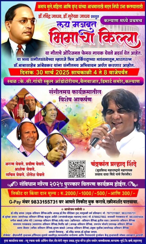 कल्याण (प्रतिनिधी):- अनाथ मुले महिला आणि वृद्ध यांच्या आश्रमासाठी मदत निधी उभा करण्यासाठी डॉ.रवींद्र जाधव व डॉ.सुरेखा जाधव प्रस्तुत ‘लय मजबूत भिमाचा किल्ला’ या गीताचे फेमस गायक येवले ब्रदर्स गीत सादर करून या भव्य संगीत संधीच्या म्हणजेच भीम आर्केस्ट्रा च्या माध्यमातून भारतरत्न डॉ.बाबासाहेब आंबेडकर यांच्या जयंती निमित्त त्यांना संगीतमय अभिवादन अर्पण करणार आहेत.व यावेळी संविधान गौरव 2025 पुरस्कार वितरणाचा ही कार्यक्रम होणार आहे.