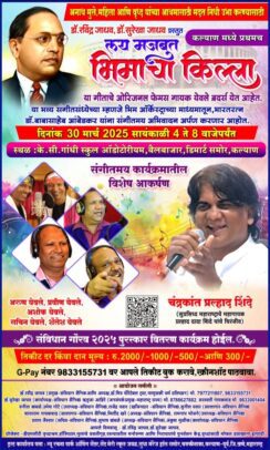 सदरील कार्यक्रम हा दि. 30 मार्च रोजी सायंकाळी 4 तें 8 वाजेपर्यंत के.सी.गांधी स्कूल, ऑडोटोरियम,बैल बाजार,डी मार्ट समोर कल्याण येथे होणार आहे.हा कार्यक्रम यशस्वी करण्यासाठी तसेच अनाथ आश्रमासाठी निधी उपलब्ध करण्यासाठी सर्वांनी या कार्यक्रमाला हातभार लावावा असे आवाहन आयोजकांच्या वतीने करण्यात आले आहे.तरी सर्वांनी ‘लय मजबूत भिमाचा किल्ला’ या कार्यक्रमाची तिकिटे घेऊन अनाथ मुले महिला आणि वृद्ध यांच्या आश्रमासाठी आपल्याकडून थोडीशी अल्पशी मदत करूया…