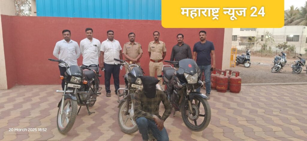 आदेशाप्रमाणे पोलीस अंमलदार पेट्रोलिंग करत असताना रेकॉर्डवरील सराईत मोटार सायकल चोर विनोद उर्फ पांडया बाळकडू सरकाळे (३० वर्ष माळीवाडा ता.जि.अहिल्यानगर) हा तारकपुर ने मिस्कीन मळा रोडवर संशत्यारित्या मोटार सायकलवर फिरत असताना मिळून आल्याने त्यास थांबवुन त्यास त्याच्याकडे मोटार सायकलच्या कागदपत्राबाबत विचारपुस केली असता त्याने काही समाधानकारक उत्तर न दिल्याने त्यास ताब्यात घेवुन त्याच्याकडे अधिक विचारपुस केली असता त्याने अहिल्यानगर शहरातून तीन मोटार सायकल चोरी केल्याची कबुली देवून खालीलप्रमाणे मोटार सायकल काढून दिल्याने त्या गुन्ह्याच्या तपासकामी जप्त करण्यात आल्या आहे.