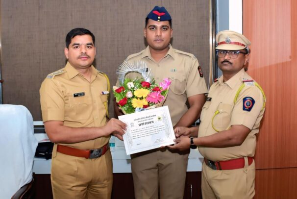अहिल्यानगर (प्रतिनिधी):- तोफखाना पोलीस ठाण्याचे कर्तव्यदक्ष अंमलदार सुजय विल्यम हिवाळे यांनी कौशल्यपूर्ण कामगिरी करून ‘TOP COP OF THE MONTH’ पुरस्कार प्राप्त केल्याबद्दल उपविभागीय पोलीस अधिकारी नगर शहर विभाग श्री. अमोल भारती यांनी हिवाळे यांना प्रशंसा पत्र देऊन गौरव केला.