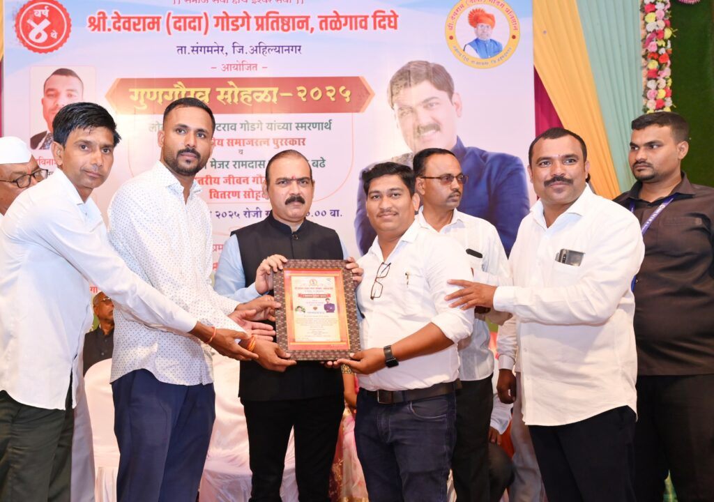 संगमनेर (प्रतिनिधी):- संगमनेर तालुक्यातील काकडवाडी गावचे भूमिपुत्र तसेच रयत शेतकरी संघटनेचे संगमनेर तालुका अध्यक्ष व संगमनेर तालुका ग्रामीण मराठी पत्रकार संघाचे उपाध्यक्ष पत्रकार दत्तात्रय घोलप यांचा पत्रकारिता व सामाजिक क्षेत्रात उल्लेखनीय व कौतुकास्पद कार्याबद्दल आज तळेगाव दिघे येथील संस्कृती मंगल कार्यालयात दे.ना.गोडगे प्रतिष्ठानच्या विविध पुरस्कार वितरण सोहळ्याप्रसंगी हास्य विनोदी व निसर्गप्रेमी सिनेअभिनेते मकरंद अनासपुरे यांच्या शुभहस्ते समाजरत्न पुरस्कार देऊन सन्मानित करण्यात आले.
