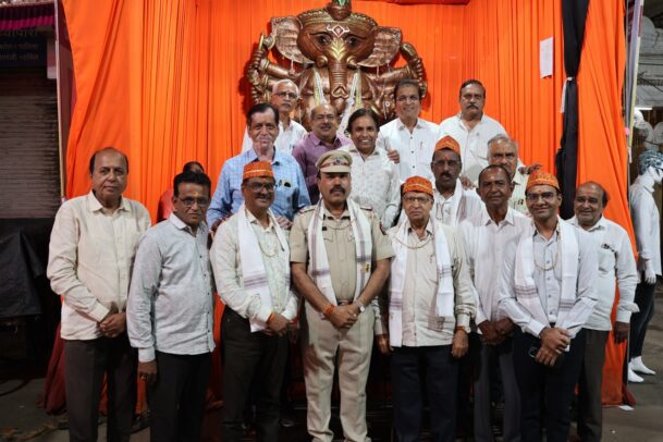 अहिल्यानगर (प्रतिनिधी):-कापड बाजार येथील आदर्श व्यापारी मित्र मंडळाच्या वतीने गेल्या वीस वर्षांपासून गणेश उत्सव मोठ्या उत्साहात साजरा केला जात असून दररोज विविध मान्यवरांच्या हस्ते महाआरती करून त्यांचा सन्मान करण्यात येतो. याच पार्श्वभूमीवर पोलीस दलात तब्बल 34 वर्षे उत्कृष्ट सेवा करून राष्ट्रपती पदक पुरस्काराने सन्मानित झाल्याबद्दल पीएसआय राजेंद्र वाघ यांचा मंडळाच्या वतीने सत्कार करण्यात आला. यावेळी मर्चंट बँकेचे माजी चेअरमन अण्णा शेठ मुनोत, संचालक विजय कोथिंबीर, धीरज लड्डा, निखिल गांधी यांचादेखील सन्मान करण्यात आला. या कार्यक्रमाला मंडळाचे संस्थापक संजय चोपडा, अध्यक्ष राजेंद्र तातेड, राजेंद्र गांधी, बाबासाहेब गोरे, अजय गुगळे, बापू गांधी, अशोक कर्णावट, हेमंत जोशी, किरण पोखरणा, संतोष भळगट आदी मान्यवर उपस्थित होते.