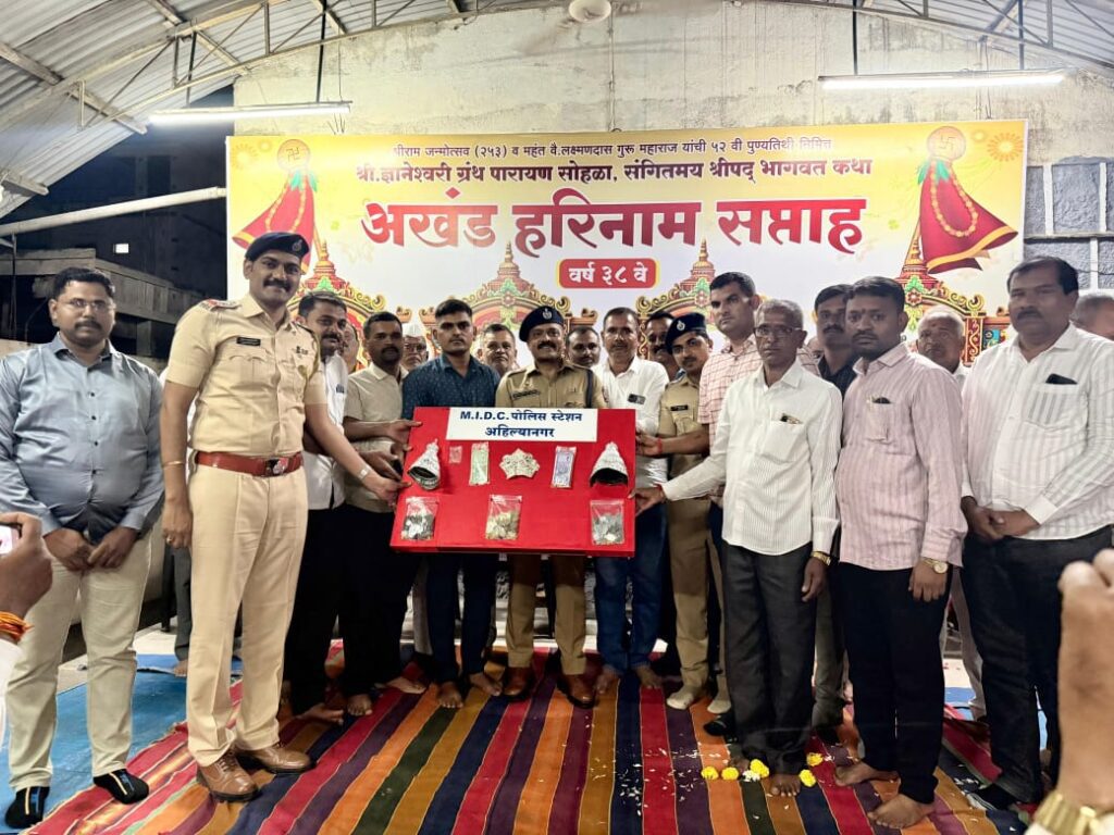 शिंगवे नाईक ग्रामस्थांचा संभ्रम दूर प्रत्यक्ष चोरांना पकडून एमआयडीसी पोलिसांनी सोन्याचे दागिने व रोख रक्कम केली हस्तगत…जिल्हा पोलीस अधीक्षकांच्या हस्ते सोन्याचे दागिने व रोख रक्कम मंदिर व्यवस्थापनाला केले परत
