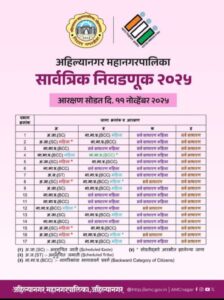 अहिल्यानगर (प्रतिनिधी):-राज्य निवडणूक आयोगाच्या नियमानुसार आज,सोमवार दिनांक ११ नोव्हेंबर रोजी अहिल्यानगर महानगरपालिकेच्या प्रभागनिहाय आरक्षणासाठी पारदर्शक पद्धतीने सोडत काढण्यात आली. महानगरपालिकेच्या सभागृहात ही सोडत शालेय विद्यार्थ्यांच्या हस्ते चिठ्ठी काढून करण्यात आली.या वेळी आरक्षण प्रक्रियेबाबतची माहिती आयुक्त तथा प्रशासक यशवंत डांगे यांनी दिली.आयुक्त डांगे यांनी सांगितले की, आरक्षण सोडतीनंतरचा निकाल राज्य निवडणूक आयोगाकडे मान्यतेसाठी सादर करण्यात आला असून आयोगाच्या मान्यतेनंतर प्रारूप आरक्षण १७ नोव्हेंबर रोजी प्रसिद्ध करण्यात येईल.