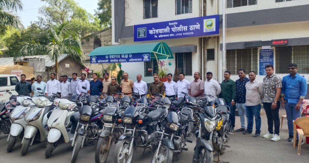अहिल्यानगर (प्रतिनिधी):-शहरातील मोटारसायकल चोरीच्या वाढत्या घटनांना आळा बसावा यासाठी कोतवाली पोलिसांनी राबवलेल्या विशेष मोहिमेत मोठे यश मिळाले आहे.शहरातून सराईतपणे मोटारसायकली चोरणाऱ्या दोन आरोपींना अटक करण्यात आली असून त्यांच्या कब्जातून तब्बल 06 लाख 25 हजार रुपये किमतीच्या 24 मोटारसायकली हस्तगत करण्यात पोलिसांना यश आले आहे.दि.28 नोव्हेंबर 2025 रोजी सकाळी कोतवाली पोलीस ठाण्याचे पोलीस निरीक्षक श्री. संभाजी गायकवाड यांच्या मार्गदर्शनाखाली पोलीस उपनिरीक्षक गणेश देशमुख यांना मिळालेल्या गोपनीय माहितीच्या आधारे ही कारवाई करण्यात आली.दोन्ही आरोपींनी शहरातील तसेच तालुक्यातून विविध भागातून मोटारसायकली चोरून वेगवेगळ्या तालुक्यात विक्रीस ठेवल्याचे तपासात समोर आले. पोलिसांनी जलदगतीने केलेल्या चौकशी दरम्यान दोघांनी चोरलेल्या वाहनांची कबुली दिली. त्यानंतर पोलिसांनी विविध ठिकाणी शोधमोहीम राबवून 24 मोटारसायकली जप्त केल्या.जप्त वाहनांमध्ये होंडा,हिरो,पॅशन प्रो, स्प्लेंडर, दुचाकी स्कुटर यांचा समावेश असून प्रत्येक वाहनाची नंबर, चेसिस आणि इंजिन नंबरच्या आधारे पडताळणी करण्यात आली आहे. अनेक मोटारसायकलींच्या चोरीचे गुन्हे संबंधित पोलिस ठाण्यांमध्ये दाखल आहेत.