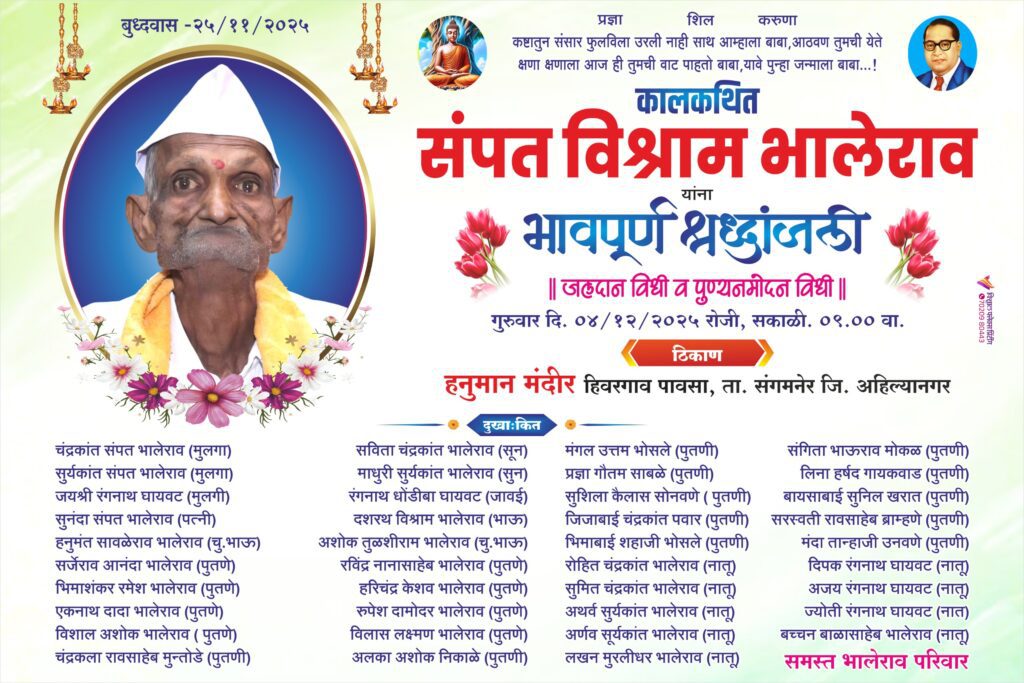 विहिरी,मोटार व पाईपलाईन करून बागायती शेती विकसित केली.लोककलावंत भालेराव त्यांच्या पश्चात पत्नी,दोन मुले एक मुलगी,सुना,नातवंडे असा मोठा परिवार आहे.त्यांच्या निधनाने हिवरगाव पावसा पंचक्रोशीतून हळहळ व्यक्त होत आहे.त्यांचा जलदन विधी हिवरगाव पावसा हनुमान मंदिरासमोरील सामाजिक सभागृह येथे गुरुवार दि. 4 डिसेंबर रोजी सकाळी 9 वाजता होणार आहे.