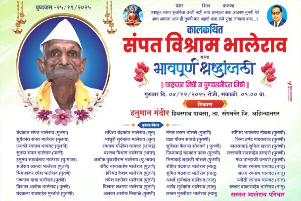 संगमनेर प्रतिनिधी (नितीनचंद्र भालेराव):-महाराष्ट्रातील संस्कृती विविध लोकसंगीत अन् वाद्य प्रकारने नटलेली आहे.याच वाद्य प्रकारातील एक प्रकार म्हणजे संबळ वादन.संबळ वाजलं आणि पावलं थिरकली नाही असं कधी होणार नाही.संबळमध्ये एक विशिष्ट प्रकारचा लय, तालबद्धतेमुळे अनेकांना नाचायला भाग पाडणारे संबळ वादक संपत विश्राम भालेराव. असंख्य कार्यक्रमांमध्ये संबळ वादनाचे सादरीकरण केले असे हिवरगाव पावसा येथील ज्येष्ठ संबळ वादक संपत भालेराव यांचे वृद्धापकाळाने वयाच्या 83 व्या वर्षी निधन झाले आहे.लोककलावंत म्हणून संपत भालेराव यांनी तब्बल 50 वर्षे कार्य केले. त्यांच्या निधनानंतर रिपब्लिकन पार्टी ऑफ इंडियाचे प्रदेशाध्यक्ष उपाध्यक्ष श्रीकांत भालेराव,मास्टर रघुवीर खेडकर,राजहंस दूध संघाचे संचालक डॉक्टर प्रमोद पावसे,भाजपा माजी तालुकाध्यक्ष काशिनाथ पावसे,सरपंच सुभाष गडाख,गणेश दवंगे,मास्टर विलास कुमार( राज) गायकवाड देवठाणकर सह सौ.शेषकन्या पुणेकर लोकनाट्य तमाशा मंडळ केंद्र संगमनेर,भारत नागपूरकर,सविता पुणेकर,सुनील औरंगाबादकर यांच्या सह लोककला क्षेत्रातील अनेक कलाकारांनी तसेच मान्यवरांनी शोक व्यक्त केला आहे.