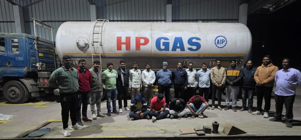 अहिल्यानगर (प्रतिनिधी):-केडगाव बायपास रोडलगत असलेल्या एका पत्र्याच्या गोदामात चालत असलेल्या गॅस रिफिलींगच्या धोकादायक आणि बेकायदेशीर धंद्याचा पर्दाफाश करत स्थानिक गुन्हे शाखेने मोठी कारवाई केली आहे.यामध्ये तब्बल 41 लाख 26,339/रु.किमतीचा प्रचंड मुद्देमाल जप्त करण्यात आला असून,चार आरोपींना अटक आणि गोदामाचा मालक मात्र फरार झाला आहे.दि.07 डिसेंबर 2025 रोजी स्थानीय गुन्हे शाखेचे पोनि.किरणकुमार कबाडी यांना खात्रीशीर गुप्त माहिती मिळाली की अनुराज टायर नावाच्या गोदामात गॅस टॅकरमधून थेट व्यावसायिक गॅस टाक्यांमध्ये अवैधरित्या रिफिलींग सुरू आहे.या माहिती नुसार श्री. कबाडी यांनी पोलीस अधिकारी हरिष भोये,अनंत सालुगडे यांच्यासह पथकाला तात्काळ कारवाईचे आदेश दिले.पथकाने तत्परतेने छापा टाकत धोकादायक पद्धतीने रिफिलींग करणाऱ्या चार इसमांना रंगेहाथ पकडले.कृष्णा मधुकर दहिफळे,अदित्य सुनिल पवार,विश्वास त्रिंबक शिंदे,जनातुल शेख असे पकडलेल्या आरोपींची नावे आहेत.चौकशीत त्यांनी कबुली दिली की त्यांच्याकडे कोणताही परवाना नसून,केवळ आर्थिक फायद्यासाठी एचपी गॅस टॅकरमधून बेकायदेशीर रिफिलींग चालू होते.