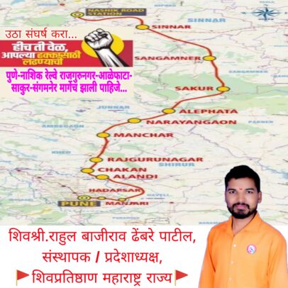 भारत सरकारमधील कार्यक्षम केंद्रीय रेल्वेमंत्री अश्विनी वैश्नव यांनी याअगोदर केंद्रीय दुरसंचार मंत्री असताना दुर्गम डोंगरी भागातील नॉटरिचेबल गावे नेटवर्कयुक्त करण्यात मोलाचे योगदान दिलेले असल्याकारणाने पुणे – नाशिक रेल्वे पुर्वनियोजीत पद्धतीनेच होणे का गरजेचे आहे याचे महत्त्व लक्षात घेऊन प्रकल्पाला यशस्वीपणे पूर्ण करतील असा विश्वास शिवप्रतिष्ठाण महाराष्ट्र राज्य संघटनेचे संस्थापक प्रदेशाध्यक्ष शिवश्री राहुल बाजीराव ढेंबरे पाटील यांना वाटतो. तसेच संबंधित पुणे नाशिक रेल्वेप्रकल्प पुर्व नियोजित मार्गानेच व्हायला हवा, त्यासंदर्भात पुढील कार्यवाही व्हावी यासाठी सर्वसामान्य लोकांच्या जनभावना देखील तिव्र स्वरूपाच्या असुन लवकरात लवकर निर्णय घ्या अन्यथा पुढील काळात होणाऱ्या जन आंदोलनांमध्ये शिवप्रतिष्ठाण महाराष्ट्र राज्य संघटना सक्रिय सहभागी होईल असा इशारा शिवप्रतिष्ठाण महाराष्ट्र राज्य संघटनेचे संस्थापक प्रदेशाध्यक्ष शिवश्री राहुल ढेंबरे पाटील यांनी दिला आहे.