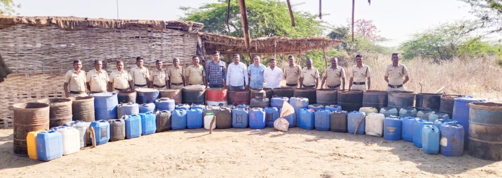 वर्धा प्रतिनिधी (सागर झोरे):- शिवणी पारधी बेड़ा येथे वॉश आउट मोहीम राबविली असता,मोहिमे दरम्यान पारधी बेड्यालगत असलेल्या पडीत शेत शिवारात जमिनीत गाडुन असलेले व झुडपात लपवुन ठेवुन असलेले 24 लोखंडी ड्रम व 47 प्लास्ट्रिक ड्रममध्ये अंदाजे 5,950 लीटर कच्चा मोहा सड़वा रसायन प्रति लीटर 50 रु.प्रमाने 2,97,500 रु,24 लोखंडी ड्रम प्रती ड्रम किं.500 रू. प्रमाणे 12,000 रू., 47 प्लास्ट्रीक ड्रम प्रती 300 रू प्रमाणे 14,100 रू, व 24 प्लास्टीक कॅनपैकी 07 कॅनमध्ये प्रती कॅन अंदाजे 35 ली प्रमाणे एकुण 245 ली गावठी मोहा दारू प्रती ली. 100 रू. प्रमाणे 24,500 रू. व 24 कॅन प्रती कॅन किं 200 रू. प्रमाणे 5,600 रू. व एक जर्मन घमेला किं.1000 रू. असा एकुण जु.किं. 3,54,700 रू.चा मोठ्या प्रमाणात मोहा सड़वा रसायन व मोहा दारूचा माल मिळुन आला असुन, सदरचा माल हा आरोपीता नामे 1) ईकावती चंदास पवार, वय 38 वर्ष, रा. शिवणी पारधी बेडा,तह.समुद्रपूर, 2)अनु सुनिल काळे,वय 56 वर्ष,रा. शिवणी पारधी बेडा तह. समुद्रपूर, 3) शारदा जुजाब पवार, वय 45 वर्ष, रा. शिवणी पारधी बेडा तह. समुद्रपूर,यांचे मालकिचा असल्याचे निष्पन्न झाल्याने, जागीचं मोक्का जप्ती पंचनामा कार्यवाही व सि.ए. सॅम्पल तयार करून उर्वरित संपुर्ण मुद्देमाल जागीच नाश करण्यात आला असुन,तिन्ही आरेापीतां विरूध्द पो.स्टे. समुद्रपुर येथे महाराष्ट्र दारूबंदी कायद्यान्वये गुन्हे नोंद करण्यात आले. सदरची कार्यवाही पोलीस अधिक्षक श्री.नुरूल हसन,अपर पोलीस अधिक्षक श्री.डॉ.सागर कवडे,उपविभागीय पोलीस अधिकारी श्री.दिनेश कदम यांचे मार्गदर्शनाखाली पोलीस स्टेशन समुद्रपूरचे पोलीस निरीक्षक श्री.प्रशांत काळे,सफौ/विक्की मस्के, पो.हवा.अरविंद येनुरकर, पोना/रवि पुरोहित,पोशि/ वैभव चरडे,चापो.हवा/कृष्णा इंगळे व 13 होमगार्ड सैनिक यांनी केली.