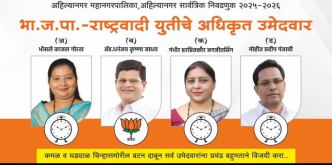 अहिल्यानगर मनपा निवडणुकीसाठी भा.ज.पा.राष्ट्रवादी युतीच्या प्रभाग क्र.५ च्या उमेदवारांच्या प्रचाराचा आज भव्य शुभारंभ