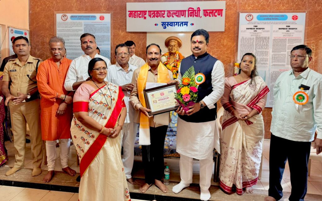 संगमनेर प्रतिनिधी (नितीनचंद्र भालेराव):-येथील ज्येष्ठ पत्रकार प्रकाश कुलथे यांना वृत्तपत्र क्षेत्रातील प्रतिष्ठेचा राज्यस्तरीय आचार्य बाळशास्त्री जांभेकर दर्पण पुरस्कार पत्रकार दिनी बाळशास्त्री जांभेकर यांचा जन्मगाव असलेल्या पोंभुर्ले तालुका देवगड जिल्हा सिंधुदुर्ग येथील स्मारक म्हणून उभारलेल्या दर्पण सभागृहात महाराष्ट्र विधान परिषदेचे सभापती प्रा.राम शिंदे यांच्या शुभहस्ते प्रदान करण्यात आला.यावेळी व्यासपीठावर सिंधुदुर्गच्या जिल्हाधिकारी तृप्ती घोडमिसे,पोलीस अधीक्षक डॉ. मोहन दहिकर,महाराष्ट्र पत्रकार कल्याण निधीचे अध्यक्ष रवींद्र बेडकीहाळ,उपाध्यक्ष कृष्णा शेवडीकर,माजी आमदार रमेश जठार,मुंबई आकाशवाणीचे सहाय्यक केंद्र संचालक जयेंद्र भाटकर उपस्थित होते.