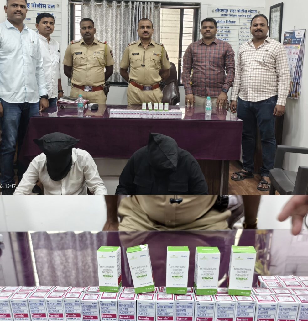 तपासा दरम्यान त्यांच्या ताब्यातून मोठ्या प्रमाणावर नशेसाठी वापरल्या जाणाऱ्या मेफेंटरमिन सल्फेट इंजेक्शनच्या बाटल्या आढळून आल्या.यात TERMIVA या औषधाच्या ५ बाटल्या (प्रत्येकी 30 mg/ml, किंमत सुमारे १,५६९ रुपये) TERMIN या औषधाच्या ५० बाटल्या (प्रत्येकी 30 mg/ml, किंमत सुमारे १८,९५० रुपये) असा एकूण २०,५१९ रुपयांचा मुद्देमाल जप्त करण्यात आला.ही औषधे बेकायदेशीररित्या विक्रीसाठी साठवून ठेवली असल्याचे स्पष्ट झाल्याने दोन्ही आरोपींना तात्काळ अटक करण्यात आली.त्यांच्या विरोधात श्रीरामपूर शहर पोलीस स्टेशन येथे गुन्हा क्रमांक १९७/२०२६ अन्वये भारतीय न्याय संहिता २०२३ च्या कलम १२३, १२५ व २७८ प्रमाणे गुन्हा दाखल करण्यात आला आहे.शहर पोलिसांच्या या धाडसी कारवाईमुळे नशेच्या पदार्थांच्या बेकायदेशीर विक्रीवर मोठा आळा बसणार असून, अशा प्रकारच्या गैरप्रकारांविरुद्ध पुढेही कठोर कारवाई सुरूच राहणार असल्याचे संकेत पोलिसांनी दिले आहेत.