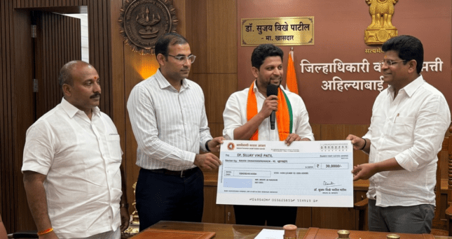💰 ६.८८ लाखांचा धनादेश सुपूर्त होमगार्डचे प्रतिदिन १,२८३ रुपयांप्रमाणे एकूण ६,८८,१९७ रुपये इतके मानधन देय झाले होते.दिलेला शब्द पाळत अहिल्यानगर शहर भाजपा व विखे पाटील परिवार यांच्या वतीने सुमारे ७ लाख रुपयांचा धनादेश २४ मार्च रोजी जिल्हाधिकारी डॉ.पंकज आशिया यांच्याकडे सुपूर्द करण्यात आला.यावेळी उपमहापौर धनंजय जाधव यांच्यासह पदाधिकारी उपस्थित होते.
