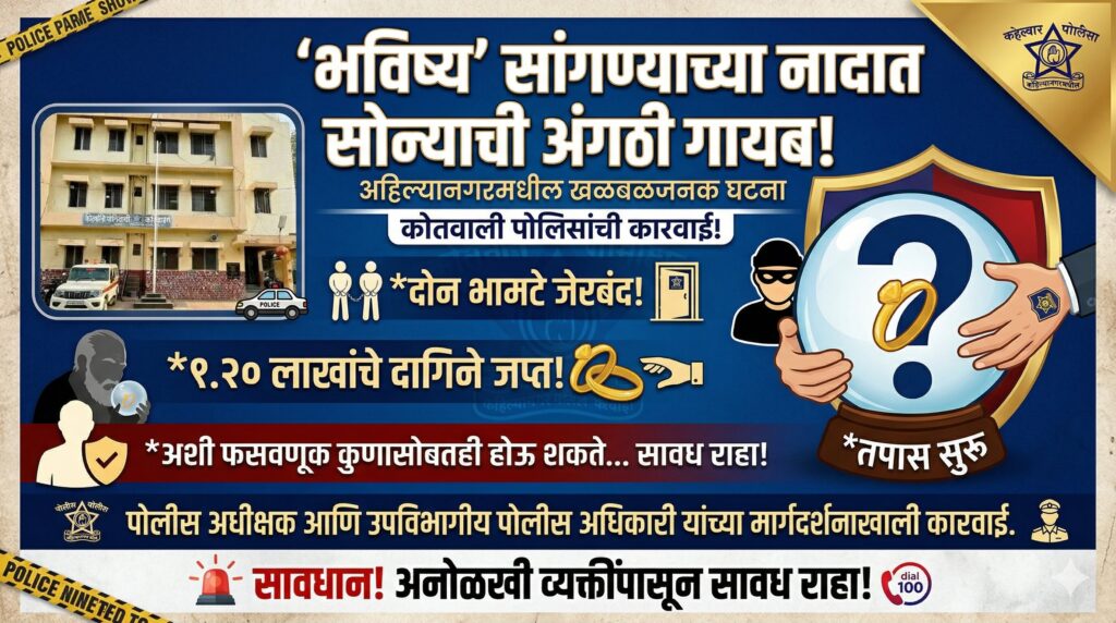 २. दुसरी घटना (सावेडी): फिर्यादी अरुण सहादु निंबाळकर (वय ७४ वर्ष) हे सावेडी येथील पुणे एसटी स्टँडवर बसची वाट पाहत असताना, त्यांनाही याच पद्धतीने भविष्य सांगण्याच्या बहाण्याने फसवून त्यांची सोन्याची अंगठी चोरली होती.