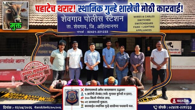 छापा टाकला तेव्हा काही इसम प्रत्यक्ष गोमांसाची विक्री करत होते.पोलिसांनी घटनास्थळावरून पाच जणांना ताब्यात घेतले असून त्यांची नावे खालीलप्रमाणे आहेत:मुनावर अब्बास कुरेशी (वय ४८, रा. शेवगाव),अदनान मन्सुर कुरेशी (वय २३, रा. सम्राट अशोकनगर, शेवगाव),जावेद अहमद शेख (वय ३५, रा. नायकवाडी मोहल्ला,शेवगाव),जाकीर मोहम्मद शेख (वय ४०, रा. शेवगाव),जावेद फकीर मोहम्मद शेख (वय ४२, रा. शेवगाव),६८ हजारांचा मुद्देमाल जप्त या कारवाईत पोलिसांनी केवळ आरोपींनाच पकडले नाही, तर मोठ्या प्रमाणात मुद्देमालही हस्तगत केला आहे:गोमांस: २०० किलो (किंमत ४०,००० रुपये) जीवंत जनावर: १ गोवंशीय जनावर (किंमत ५,००० रुपये) साहित्य: वजनकाटा, २ चाकू, सुरा, कुऱ्हाड आणि टोचा.इतर: २०,००० रुपयांचे दोन मोबाईल.एकूण जप्त मुद्देमाल: ६८,५०० रुपये.अटक करण्यात आलेल्या सर्व आरोपींविरुद्ध भारतीय न्याय संहिता २०२३ चे कलम २७१, ३२५, ३(५) आणि प्राणी संरक्षण अधिनियम कलम ५(क), ९ नुसार शेवगाव पोलीस ठाण्यात गुन्हा दाखल करण्यात आला आहे.