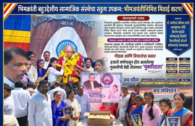 सोलापूर (प्रतिनिधी):-भारतीय राज्यघटनेचे शिल्पकार,विश्वरत्न डॉ.बाबासाहेब आंबेडकर यांच्या जयंतीचे औचित्य साधून भिमक्रांती बहुउद्देशीय सामाजिक संस्थेच्या वतीने शहरात मिठाई वाटपाचा कार्यक्रम अत्यंत उत्साहात आणि आनंदी वातावरणात पार पडला. डॉ.बाबासाहेब आंबेडकर यांच्या विचारांचा वारसा पुढे नेण्यासाठी आणि समाजात गोडवा निर्माण करण्यासाठी हा उपक्रम राबवण्यात आला.यावेळी भीमजयंतीचा उत्साह सर्वत्र पाहायला मिळत होता.भिमक्रांती संस्थेच्या पदाधिकारी आणि कार्यकर्त्यांनी एकत्र येत ‘जय भीम’ आणि ‘जय संविधान’च्या घोषणा देत हा दिवस साजरा केला.या सोहळ्यासाठी संस्थेच्या संस्थापक अध्यक्षा सौ. स्वातीताई अविनाश धाईंजे, अध्यक्ष शामकुमार लोंढे व किरण धाईंजे प्रामुख्याने उपस्थित होते. तसेच नगरसेविका मनिषाताई तिकोटे,नगरसेविका वैशालीताई भोसले आणि नगरसेविका प्रतिभाताई गायकवाड यांनी उपस्थित राहून या उपक्रमाचे कौतुक केले.