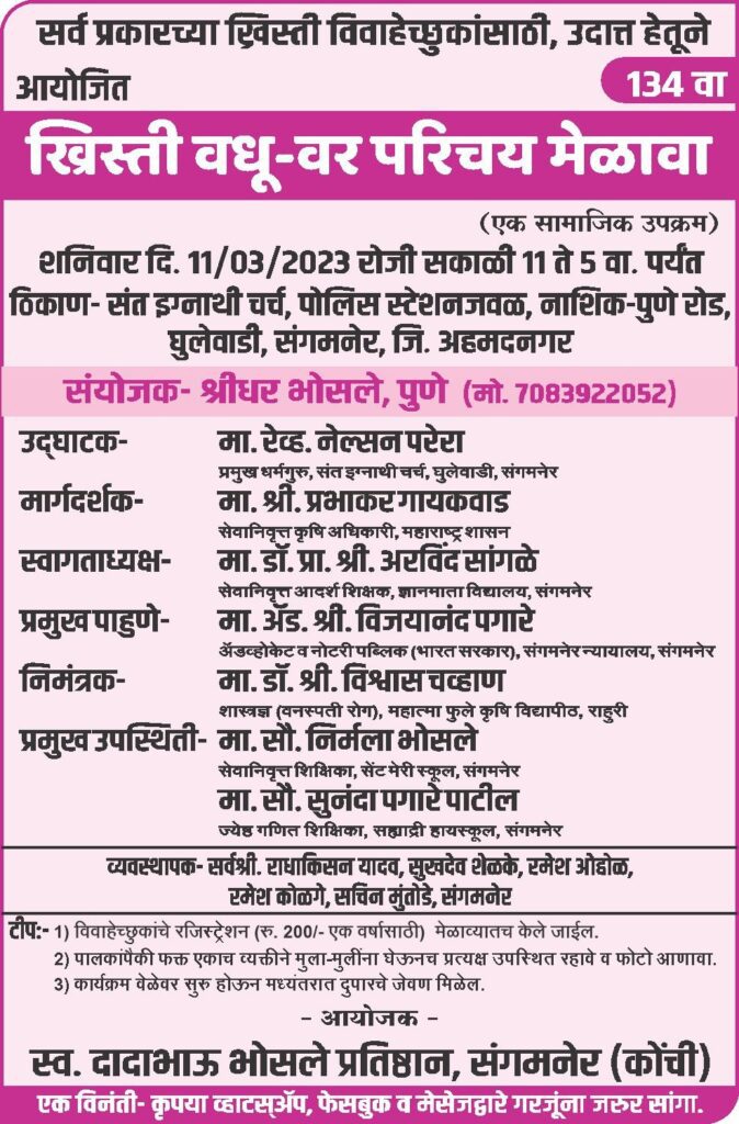 अहमदनगर प्रतिनिधी(दि.६ मार्च):-अहमदनगर जिल्ह्यातील संगमनेर तालुक्यात भव्य ख्रिस्ती वधु वर परिचय मेळाव्याचे आयोजन केले आहे.हा वधू वर मेळावा संत इग्नाथी चर्च, पोलीस स्टेशन जवळ नाशिक पुणे रोड घुलेवाडी ता.संगमनेर येथे शनिवार दि.११/३/२०२३ रोजी सकाळी ११ ते ५ वाजेपर्यंत आयोजित केलेला आहे.तरी ख्रिस्तीविवाह इच्छुक वर मुला मुलींनी याचा लाभ घ्यावा असे आवाहन आयोजकांच्या वतीने करण्यात आले आहे.