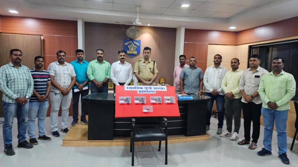 अहमदनगर प्रतिनिधी (दि.२६ मार्च):-श्रीरामपूर तालुक्यातील बेलापुर बु.येथील बाजारतळ येथे विक्री करण्याचे उद्देशाने चार (०४) गावठी कट्टे व आठ (०८) जिवंत काडतुसे अवैधरित्या कब्जात बाळगणारे दोन आरोपी १,४५,७००/- रु.किंमतीचे मुद्देमालासह जेरबंद करण्यात स्थानिक गुन्हे शाखेला यश आले आहे.जिल्हा पोलीस अधीक्षक राकेश ओला साहेब,यांनी पोलीस निरीक्षक अनिल कटके,स्थानिक गुन्हे शाखा,अहमदनगर यांना जिल्ह्यात अवैध अग्नीशस्त्रे व हत्यारे या विरुध्द जास्तीत जास्त कारवाई करणे बाबत आदेश दिले होते.नमुद आदेशान्वये अहमदनगर स्थानिक गुन्हे शाखेचे पोलीस निरीक्षक अनिल कटके हे जिल्ह्यातील अवैध अग्नीशस्त्रे व हत्यारे याबाबत माहिती घेत असतांना गुप्तबातमीदारा कडून माहिती मिळाली की, रेकॉर्ड वरील इसम नामे दत्तात्रय डहाळे रा.शिर्डी हा त्याचे साथीदारासह गावठी कट्टे व जिवंत काडतुसे विक्री करण्यासाठी बाजारतळ, बेलापुर बुद्रुक ता.श्रीरामपुर येथे येणार आहेत आता गेल्यास मिळुन येईल अशी खात्रीशीर माहिती मिळाल्याने अहमदनगर स्थानिक गुन्हे शाखेचे पोलीस निरीक्षक अनिल कटके यांनी स्थानिक गुन्हे शाखेतील पोलीस अंमलदार यांचे पथक नेमुन मिळालेल्या बातमीनुसार खात्री करुन कारवाई करण्याबाबत आदेश दिले. नमुद आदेशाप्रमाणे स्थानिक गुन्हे शाखेच्या पथकातील पोसई/सोपान गोरे,पोहेकॉ/ २१४५ मनोहर सिताराम गोसावी,पोहेकॉ/२१६४ दत्तात्रय विठ्ठल गव्हाणे, पोहेकॉ/८७२ सुरेश माळी, पोहेकॉ/संदिप घोडके पोना/ विशाल दळवी,पोना/शंकर चौधरी,पोना/दिलीप शिंदे, पोना/संदिप चव्हाण पोकॉ/ सागर ससाणे,पोकॉ/रोहित येमुल पोकॉ/रणजित जाधव व चापोहेकॉ उमांकात गावडे, चापोहेकॉ/अर्जुन बडे अशांनी मिळून वेशांतर करुन मिळालेल्या बातमीचे अनुषंगाने बेलापुर बु ता. श्रीरामपुर येथील बाजारतळ येथे जावुन सापळा लावुन थांबलो असता नमुद बातमी प्रमाणे रेकॉर्डवरील इसम नामे दत्तात्रय डहाळे व त्याचे सोबत एक इसम बेलापुर बु॥ बाजार वेशीतून बाजारतळाकडे पायी येतांना दिसल्याने पथकाची खात्री झाल्याने त्यांना ताब्यात घेवुन त्यांचे नाव पत्ता विचारले असता त्यांनी त्यांचे नावे (१)दत्तात्रय सुरेश डहाळे वय ३४ रा.श्रीराम नगर, शिर्डी,ता.राहाता जि. अहमदनगर (२) सुलतान फत्तेमोहमद शेख वय २९ रा. महलगल्ली,बेलापुर बु.ता. श्रीरामपुर जि.अहमदनगर असे असल्याचे सांगीतले.त्यांचे अंगझडतीत एकुण १,४५,७००/- रु. किमतीचा मुददेमाल त्यात ०४ देशी बनावटीचे पिस्टल,८ जिवंत काडतूसे असा मुद्देमाल वरील नमुद दोन्ही इसमांचे कब्जात मिळून आला आहे.दत्तात्रय सुरेश डहाळे वय ३४ रा. श्रीराम नगर,शिर्डी, ता. राहाता जि.अहमदनगर हा सराईत गुन्हेगार असुन त्याचेवर यापुर्वी औरंगाबाद जिल्हयात अग्नीशस्त्र स