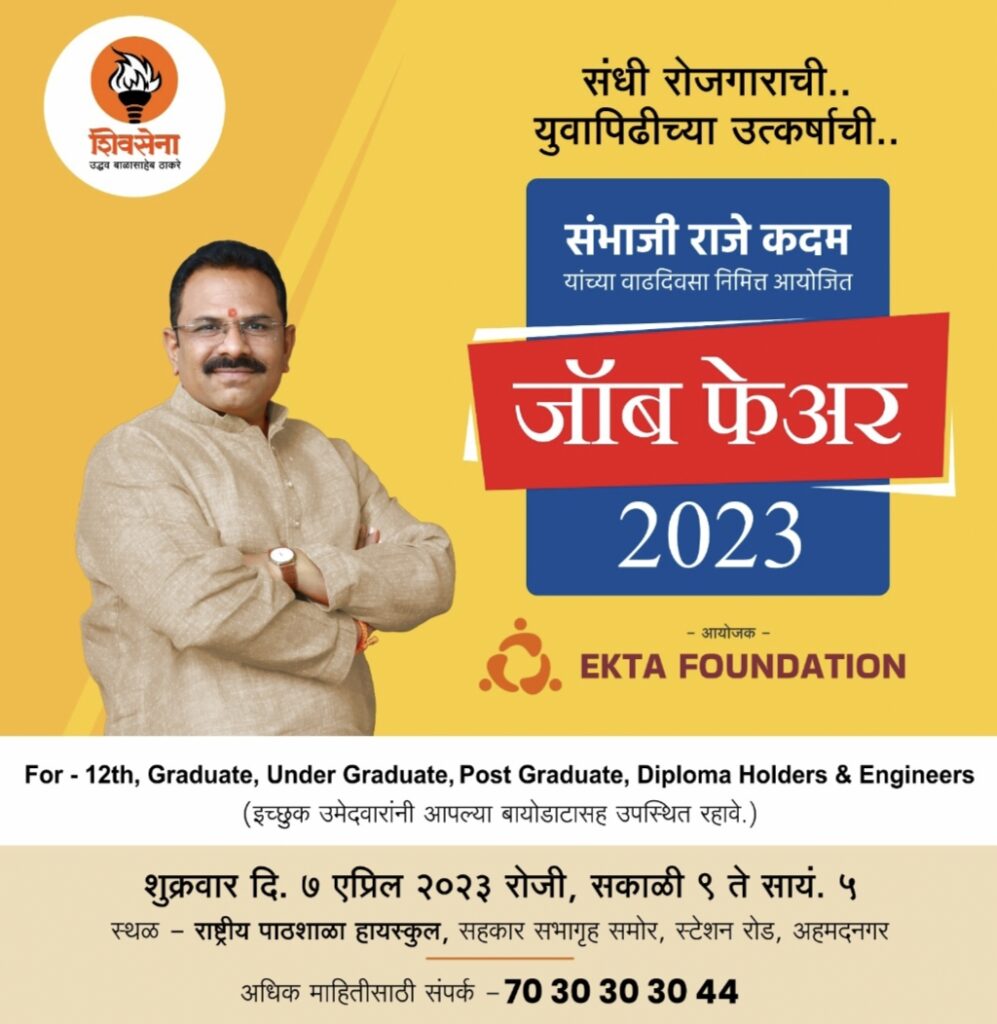 अहमदनगर प्रतिनिधी(दि.६ एप्रिल):-शुक्रवार दिनांक ७ एप्रिल २०२३ रोजी सकाळी 9 ते सायंकाळी 5 वाजेपर्यंत राष्ट्रीय पाठशाळा हायस्कूल सहकार सभागृह समोर, स्टेशन रोड,अहमदनगर येथे शिवसेना शहर प्रमुख संभाजी कदम यांच्या वाढदिवसानिमित्ताने युवकांना नोकरी मिळावी या हेतूने या नोकरी मेळाव्याचे आयोजन केले आहे.अहमदनगर,सुपा, चाकण,व विविध शहरातील ३० कंपन्याचा सहभाग असणार आहे.आय टी, इंडस्ट्रियल,फायनान्स, इंजिनीरिंग,मेडिकल , मार्केटिंग,सेल्स,मीडिया अश्या विविध क्षेत्रातील नामवंत कंपन्या या जॉब फेअरमध्ये सहभाग घेणार आहे.या जॉब फेअरमध्ये शेकडो नोकरीच्या संधी उपलब्ध असून युवकांनी आपले बायोडाटा घेऊन समक्ष इंटरवीव्ह देऊन नामाकिंत कंपनी मध्ये नोकरी मिळविण्याची संधीचे सोने करण्याचे आवाहन एकता फौंडेशन मार्फत करण्यात आले आहे.या जॉब फेअर मध्ये सहभागी होण्यासाठी ७०३०३०३०४४ किंवा ७०२०५५३५२३ या क्रमांकावर संपर्क साधावा. तसेच खलील लिंक वर गुगल फॉर्म भरून सहभागी व्हावे.