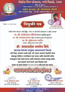 अहमदनगर प्रतिनिधी (दि.२१ एप्रिल):-नेवासा तालुक्यातील आपल्या सामाजिक कार्याने परिचित असलेले बाबासाहेब नामदेव शिंदे यांची नुकतीच पोलीस मित्र संघटनेच्या नेवासा तालुकाध्यक्षपदी निवड झाली आहे.पोलीस मित्र संघटना नवी दिल्ली भारत या संघटनेचे संस्थापक व राष्ट्रीय अध्यक्ष संतोषदादा चौधरी यांच्या आदेशानुसार श्री.गजानन भगत राष्ट्रीय जनसंपर्क प्रमुख यांच्या सूचनेनुसार व श्री.सुनील भाऊ पाटील अध्यक्ष महाराष्ट्र प्रदेश यांच्या वतीने शिंदे यांना नियुक्त पत्र देण्यात आले आहे.त्यांनी दिलेल्या पत्रात म्हणले आहे की आपल्या संघटनेचे महत्त्व ओळखून पोलीस व नागरिकांना मदत करावी आणि संघटनेची प्रतिमा जनसमुदायांमध्ये उज्वल करावी की ज्याने संघटनेचा जनाधार मजबूत होईल व लोकहिताचे कामे होतील.दि.२१ एप्रिल २०२३ रोजी बाबासाहेब शिंदे यांना हे नियुक्त पत्र देण्यात आले.