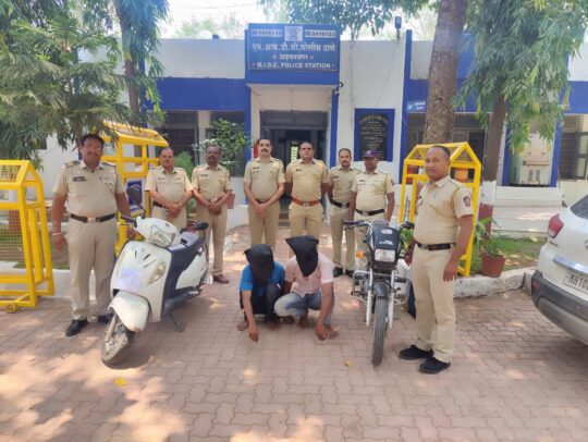 अहमदनगर प्रतिनिधी (दि.८ मे):-एमआयडीसी परीसरात घरफोडी,जबरी चोरी करणारे दोन सराईत गुन्हेगार जालना येथुन जेरबंद,एक लाख रुपये किंमतीचा मुददेमाल जप्त एमआयडीसी पोलीसांची कामगिरी,घटनेतील सविस्तर वृत्त असे की दि.३०/०४/२०२३ रोजी फिर्यादी नामे संगिता कचरु पालवे (वय.३५ वर्ष धंदा घरकाम रा.चेतना कॉलनी नवनागापुर ता.जि. अहमदनगर)यांनी एमआयडीसी पोलीस स्टेशनला फिर्याद दिली की, दि.२९/०४/२०२३ रोजी सकाळी ०८/०० ते दिनांक ३०/०४/२०२३ रोजी सकाळी ०८/०० वा चे वा.दरम्यान शिवाजीनगर चेतना कॉलनी नवनागापुर येथे फिर्यादी यांचे घराचे समोर लावलेली ऑक्टीव्हा मोपेड गाडी नंबर एम एच १७ बी सी १८०० हि तसेच घराचे दरवाज्याचे लॉक तोडुन घरामध्ये प्रवेश करुन घरातील सोन्याचे कानातील झुंबर तसेच लॉकेट असा एकुण ३३,०००/-रु एकुण मुददेमाल चोरुन नेला आहे. वैगेरे मचकुराचे फिर्यादीवरुन एमआयडीसी पोलीस स्टेशनला गुन्हा दाखल करण्यात आला होता.सदर गुन्हयाचा समांतर तपास करत असतांना सपोनि/राजेंद्र सानप यांना गोपनिय माहिती मिळाली की.सदरचा गुन्हा हा सराईत आरोपी नामे १)गजानन उर्फ गजु विष्णु गवारे रा.बुटेगाव ता.बदनापुर जि.जालना २)ऋषिकेश नवाजी गांगर्डे रा.बुटेगाव ता. बदनापुर जि.जालना यांनी केला असुन ते जालना जिल्हयात असल्याची माहिती मिळाली.त्यानुसार सपोनि/ राजेंद्र सानप यांनी एमआयडीसी पोलीस स्टेशनचे एक पथक तयार करुन त्यांना पोलीस अधीक्षक राकेश ओला यांचे आदेशाने जालना येथे पाठविले.सदर पोलीस पथकांनी बुटेगाव ता. बदनापुर जि.जालना येथून सदर आरोपींना सापळा रचुन शिताफिने ताब्यात घेतले. त्यांना त्यांचे नाव गाव विचारले असता त्यांनी त्यांची नावे १)गजानन उर्फ गजु विष्णु गवारे वय ३१ वर्ष रा. बुटेगाव ता.बदनापुर जि.जालना २)ऋषिकेश नबाजी गांगर्डे वय २८ वर्ष रा. बुटेगाव ता. बदनापुर जि. जालना असे सांगीतले.सदर आरोपीनी गुन्हयाची कबुली दिली असुन त्यांचेकडुन सदर गुन्हयात चोरी केलेली मोपेड गाडी नंबर एम एच १७ बी सी १८०० जप्त करण्यात आली आहे. व जालना येथुन चोरी केलेली स्प्लेंडर मोटार सायकल जप्त करण्यात आली आहे.त्याबाबत जालना येथे चोरीचा गुन्हा दाखल आहे.एमआयडीसी पोलीस स्टेशन येथे दाखल गुन्हयातील चोरी गेलेले सोने हस्तगत करत आहोत.सदरचे आरोपी हे सराईत असुन त्यांचेवर खालील प्रमाणे गुन्हे दाखल आहे.