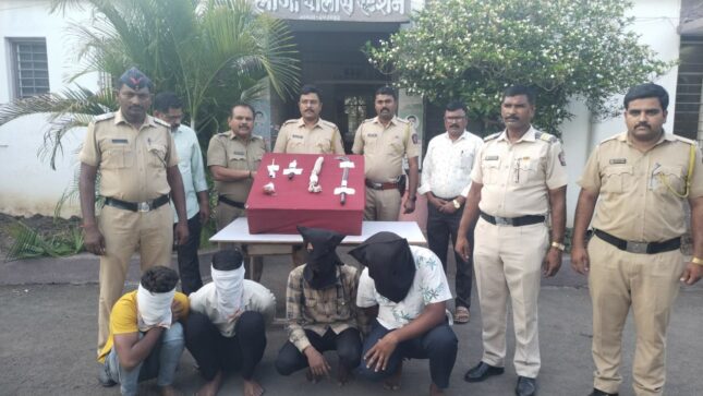 अहमदनगर प्रतिनिधी:-लोणी परिसरात दरोड्याच्या तयारीत असलेल्या राहता येथील सराईत पाच आरोपींच्या टोळीला स्थानिक गुन्हे शाखेच्या पथकाने मुद्देमालासह जेरबंद केलंय,पोलीस निरीक्षक दिनेश आहेर हे फरार व पाहिजे आरोपींचा शोध घेत असताना त्यांना गुप्त बातमीदारा मार्फत माहिती मिळाली या माहितीच्या आधारे पथकाने शिर्डी नगर रोड येथील निर्मळ पिंपरी येथे छापा टाकून आरोपींना पाठलाग करून मोठ्या शिताफीने पकडले.अजय राजू भोसले,ऋतुंजय उर्फ अमोल अविनाश कुंदे,योगेश किशोर कांबळे,साईराम राजू गुडे व एक अल्पवयीन मुलगा याला ताब्यात घेतले व सतीश बाबासाहेब खरात हा अंधाराच फायदा घेऊन पसार झाला.ताब्यात घेतलेल्या आरोपींकडून एक लोखंडी कोयता,एक चाकू,एक स्क्रू ड्रायव्हर,मिरची पूड पांढऱ्या रंगाची सुमो गाडी असा पाच लाख पाचशे रुपये किमतीचा मुद्देमाल जप्त करण्यात आला.ताब्यात घेतलेले आरोपी हे सराईत गुन्हेगार असून त्यांच्याकडून जिल्ह्यातील व राज्यातील आणि गुन्हे उघडकीस येण्याची शक्यता आहे.ही कारवाई पोलीस अधीक्षक राकेश ओला यांच्या मार्गदर्शनाखाली स्थानिक गुन्हे शाखेचे पोलीस निरीक्षक दिनेश आहेर यांच्या पथकातील पोसई/तुषार धाकराव,मनोहर गोसावी,संदीप पवार,रवींद्र कर्डिले,फुरकान शेख,प्रशांत राठोड,संतोष खैरे,आकाश काळे,अमृत आढाव,संभाजी कोतकर यांनी केली.