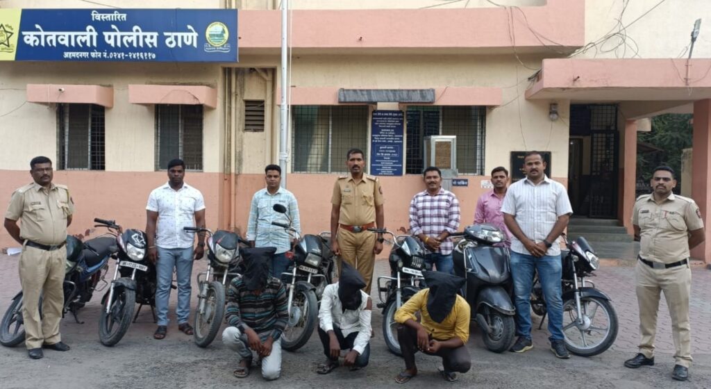 अहमदनगर प्रतिनिधी (दि.३ जुन):-कोतवाली पोलीस ठाण्याच्या हद्दीत तसेच शहर परिसरात मोटारसायकली चोरणाऱ्या टोळीला जेरबंद करण्यात कोतवाली पोलिसांना यश आले आहे. तीन मोटरसायकल चोरणाऱ्या आरोपींना कोतवाली पोलिसांनी अटक केली असून,दोन लाख पंधरा हजार रुपये किमतीच्या सात मोटारसायकल जप्त करण्यात आल्या आहेत.शहरात मोटरसायकल चोरी जाण्याचे प्रमाण गेल्या काही दिवसात वाढल्याने कोतवाली पोलिसांकडून मोटारसायकल चोरांना पकडण्यासाठी शोध मोहिम आखण्यात आली आहे.कोतवाली पोलीस ठाण्याचे पोलीस निरीक्षक चंद्रशेखर यादव यांच्या मार्गदर्शनाखाली मोटरसायकल चोरांचा शोध घेण्यासाठी पथक स्थापन करण्यात आले आहे.पोलीस निरीक्षक यादव यांना खबऱ्याकडून माहिती मिळाली होती की,मोटारसायकल चोर गणेश देविदास नल्ला हा चोरीच्या मोटारसायकलसह शहरातील आयुर्वेदीक कॉर्नर येथे येणार आहे.या माहितीच्या आधारे कोतवाली पोलीस ठाण्याच्या पथकाने सापळा लावून आरोपी गणेश देविदास नल्ला (रा.पाईपलाईन रोड, अहमदनगर) याला ताब्यात घेतले.पथकाने त्याला विश्वासात घेऊन चौकशी केली असता मोटारसायकल तोफखाना पोलीस ठाण्याच्या हद्दीतून चोरी केल्याची कबुली दिली.त्यासोबतच शहर व परिसरात साथीदारांच्या मदतीने चोरी केलेल्या मोटरसायकलच्या इतर गुन्ह्यांची कबुली त्याने दिली. तसेच,चोरीतील मोटरसायकल त्याच्या साथीदारांच्या मदतीने विक्री करत असल्याचे सांगितले.कोतवाली पोलिसांनी आरोपी गणेश देविदास नल्ला याला सोबत घेऊन त्याचे साथीदार आनंद अनिल काळे (वय २५ वर्षे, रा.गणेशनगर,वार्ड नं.२ ता. राहता,जि.अहमदनगर), सचिन रावसाहेत चव्हाण (वय २३ वर्षे,रा.पानेगाव,ता. घनसांगवी,जि.जालना) या दोघा आरोपींना ताब्यात घेतले.आरोपींकडून सात मोटरसायकली जप्त करण्यात आल्या आहेत.पोलीस अधीक्षक राकेश ओला, अप्पर पोलीस अधीक्षक प्रशांत खैरे,उपविभागीय पोलीस अधिकारी अनिल कातकाडे यांच्या मार्गदर्शनाखाली कोतवाली पोलीस ठाण्याचे पोलीस निरीक्षक/चंद्रशेखर यादव, पोलीस उपनिरीक्षक/मनोज कचरे,शाहीद शेख,पोलीस कॉन्स्टेबल प्रमोद मधुकर लहारे,सुमित गवळी,दिपक रोहोकले,पोलीस नाईक योगेश कवाष्टे,रवि टकले, महेश बोरुडे,मुकुंद दुधाळ यांनी ही कारवाई केली.या गुन्ह्यांचा तपास पोलीस नाईक सलिम शेख,तानाजी पवार करत आहेत.जप्त केलेल्या मोटरसायकल
