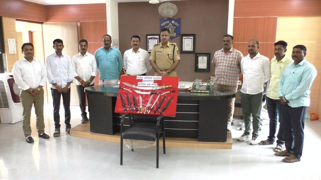 अहमदनगर प्रतिनिधी (दि.२२ जून):-अहमदनगर शहरातील मुकुंदनगर परिसरातील अवैध शस्त्र बाळगणाऱ्या आरोपींची टोळी जेरबंद करण्यात स्थानिक गुन्हे शाखेच्या पथकाला यश आले आहे.स्थानिक गुन्हे शाखेचे पथक अहमदनगर शहर व परिसरात फिरून आरोपींची माहिती घेत असताना स्थानिक गुन्हे शाखेचे पोलीस निरीक्षक दिनेश आहेर यांना गुप्त बातमीदारामार्फत माहिती मिळाली की नगर ते भिंगार जाणारे रोडवरील भिंगार नाला येथे साबीर सय्यद(रा. मुकुंदनगर, गोविंदपुरा) हा त्याच्या पाच साथीदारांसह हत्यारे घेऊन जात आहे.असल्याची माहिती स्थानिक गुन्हे अन्वेषण विभागाच्या पथकाला कळल्यानंतर त्या पथकाने साबीर सय्यद याच्या भोवती सापळा रचला त्यावेळी भिंगारनाला परिसरात साबीर सय्यद आपल्या साथीदारांसह आला असता पोलिसांनी अचानक छापा टाकुन चार इसमांना जागीच ताब्यात घेतले तर दोन इसम झाडा झुडपांचा फायदा घेवुन पळुन गेले.साबीर अस्लम सय्यद,समी मुजीब शेख,अजहर गफ्फार शेख एक अल्पवयीन मुलगा यांच्या ताब्यातून १,५००/- रुपये किंमतीची एक तलवार, १,०००/- रुपये किंमतीची एक गुप्ती व ५,५००/- रुपये किंमतीचे दहा सुरे असा एकुण ८,०००/- हजार रुपये किंमतीचा मुद्देमाल पोलिसांनी जप्त केला आहे.तर आयान समिर खान आणि सौरभ कथुरीया अशी फरार तरुणांची नावे असून हे सर्व तरुण मुकुंदनगर भागात राहत होते.याप्रकरणी स्थानिक गुन्हे शाखेचे पोलीस अंमलदार भिमराज किसन खर्से यांच्या फिर्यादीवरुन भिंगार कॅम्प पोलीस ठाण्यात आर्म अॅक्ट ३०६/२३, ४/२५ प्रमाणे गुन्हा दाखल करण्यात आला आहे.ही कारवाई जिल्हा पोलीस अधीक्षक राकेश ओला,अपर पोलीस अधिक्षक प्रशांत खैरे व उपविभागीय पोलीस अधिकारी अनिल कातकाडे यांच्या सुचना व मार्गदर्शना खाली स्थानिक गुन्हे शाखेचे पोलीस निरीक्षक दिनेश आहेर,पोसई/तुषार धाकराव,सफो/भाऊसाहेबकाळे,पोहेकॉ/बापुसाहेब फोलाणे,सुनिल चव्हाण,दत्तात्रय हिंगडे,संदीप पवार,मनोहर गोसावी,पोना/रविंद्र कर्डीले,भिमराज खर्से,विजय ठोंबरे,संतोष लोढे,पोकॉ/मेघराज कोल्हे,अमृत आढाव व चापोहेकॉ/उमाकांत गावडे यांनी केली आहे