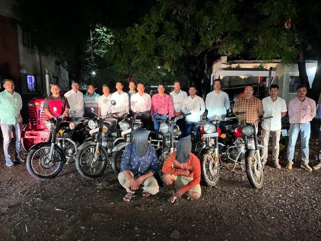 बातमीची हकिगत अशी की, दि.01 जुलै रोजी फिर्यादी श्री. राजु रोहिदास ठोकळ वय 54, रा.धुत शोरुम मागे,विनायक नगर,अहमदनगर यांनी घरा जवळ लावलेली 50,000/- रुपये किंमतीची रॉयल इनफिल्ड कंपनीची बुलेट मोटार सायकल अनोळखी आरोपींनी चोरुन नेली होती.या घटनेबाबत फिर्यादी यांनी दिलेल्या तक्रारी बाबत कोतवाली पोलीस स्टेशन 723/2023 भादविक 379 प्रमाणे मोटार सायकल चोरीचा गुन्हा दाखल करण्यात आला होता.जिल्हा पोलीस अधीक्षक राकेश ओला यांनी पोनि/श्री.दिनेश आहेर, स्थानिक गुन्हे शाखा यांना ना उघड चोरीचे गुन्हे उघडकिस आणणे बाबत आदेश दिले होते.नमुद आदेशा प्रमाणे पोनि/श्री.दिनेश आहेर यांनी स्थानिक गुन्हे शाखेतील पोलीस अंमलदार यांचे पथक नेमुण ना उघड मोटार सायकल चोरीचे गुन्हे उघडकिस आणणे बाबत सुचना देवुन पथकास तात्काळ रवाना केले.पथक नगर शहर परिसरात फिरुन आरोपींची माहिती घेताना पोनि/श्री.दिनेश आहेर यांना गुप्तबातमीदारा मार्फत माहिती मिळाली की वैभव सुरोडे,रा.आष्टी,जिल्हा बीड) याने अहमदनगर शहरातील विनायक नगर येथुन चोरी केलेली बुलेट मोटार सायकलवर साथीदारासह शेवगांव मार्गे,ब्राम्हणी,ता. राहुरी येथील किरण गर्जे व सोमनाथ हारेल यांना देण्यासाठी येणार आहे अशी खात्रीशीर माहिती मिळाल्याने पोनि/श्री.दिनेश आहेर यांनी प्राप्त माहिती पथकास कळवुन,पंचाना सोबत घेवुन खात्री करुन कारवाई करणे बाबत सुचना दिल्या.पथकाने लागलीच शेवगांव गेवराई रोडवरील नित्यसेवा हॉस्पीटल जवळ सापळा लावुन थांबलेले असताना दोन इसम काळ्या रंगाच्या विनानंबर बुलेट मोटार सायकलवर येताना दिसले.पथकाची खात्री होताच बुलेटवरील इसमांना थांबण्याचा इशारा करताच त्यांनी ताब्यातील बुलेट रस्त्याचे कडेला थांबवली. बुलेटवरील दोन्ही इसमांना पोलीस पथकाची ओळख सांगुन त्यांचे नाव गांव विचारले असता त्यांनी त्यांची नावे 1)वैभव ऊर्फ सोमा बाबासाहेब सुरोडे,वय 25,रा. मातकुळी,ता.आष्टी,जिल्हा बीड व 2) किरण अंबादास गर्जे,वय 25 रा.चिलेखनवाडी, ता.नेवासा असे सांगितले. त्यांना ताब्यातील बुलेट बाबत विचारपुस करता त्यांनी ताब्यातील बुलेट अहमदनगर शहरातील विनायक नगर येथुन चोरी केली असुन ब्राम्हणी,ता.राहुरी येथील किरण गर्जे व त्याचे काका सोमनाथ हारेल यांना देण्यासाठी जात असल्याची कबुली दिली.ताब्यातील आरोपींना अधिक विश्वासात घेवुन सखोल व बारकाईने विचारपुस करता त्यांनी त्याचे इतर साथीदार नामे 3) दादा मोरे,रा.कोपरगांव, 4) विशाल सदगिर,रा.धोंडाबे,जिल्हा नाशिक, 5) आद्दु शेख रा. जामखेड, 6) महेश सुनिल सोनवणे,रा.नॉर्दन ब्रॅच, श्रीरामपूर, 7) किरण अंबादास गर्जे,रा.चिलेखनवाडी,ता. नेवासा व 8) सोमनाथ सुभाष हारेल,रा.ब्राम्हणी,ता.राहुरी यांचे सोबत अहमदनगर,बीड, नाशिक व छत्रपती संभाजीनगर ज