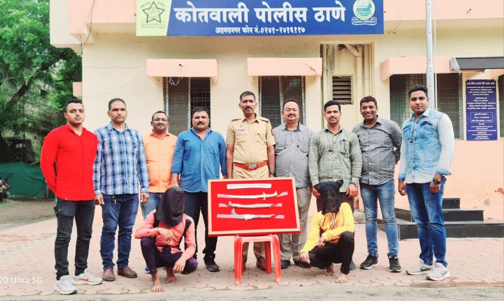ईशान सलीम शेख (वय १९ वर्ष,रा.कोटला घासगल्ली,अहमदनगर), उदय हमीद खान (वय २० वर्षे,जमजम हॉटेल शेजारी पंचपीर चावडी, अहमदनगर) अशी ताब्यात घेतलेल्या आरोपींची नावे आहेत.जुन्या महानगरपालीकेजवळ दोन जण दुचाकीच्या डिक्कीत एक तलवार व एक कोयता बाळगुन गुन्हा करण्याच्या बेतात असल्याची माहिती पोलीस निरीक्षक चंद्रशेखर यादव यांना मिळाली होती. पोलीस निरीक्षक यादव यांनी तात्काळ गुन्हे शोध पथकातील अंमलदारांना कारवाईच्या सूचना दिल्या. पथकाने जुन्या महापालिकेजवळ सापळा लावून दुचाकीवरून येत असलेल्या संशयीत दोघांना अडवून चौकशी केली. त्यांची झडती घेतली असता एक तलवार व कोयता आढळून आल्याने दोघांना त्याब्यात घेऊन कोतवाली पोलीस ठाण्यात हजर केले.तलवार व कोयता कोणाकडून व कोणत्या कामासाठी बाळगून असल्याचे विचारले असता दोन्ही शस्त्र त्यांचीच असल्याचे कबुली दिली आहे. पोलीस शिपाई अतुल केशव काजळे यांच्या फिर्यादीवरुन भारतीय हत्यार कायदा कलम ४/२५ प्रमाणे गुन्हा दाखल करण्यात आला असून, पोलीस निरीक्षक चंद्रशेखर यादव यांच्या मार्गदर्शनाखाली पोलिस नाईक सलीम शेख तपास करत आहेत.पोलीस अधिक्षक राकेश ओला,अपर पोलीस अधिक्षक प्रशांत खैरे, उपविभागीय पोलीस अधिकारी अनिल कातकाडे यांच्या मार्गदर्शनाखाली पोलिस निरीक्षक चंद्रशेखर यादव,पोलिसअंमलदार तनवीर शेख,गणेश धोत्रे, योगेश भिंगारदिवे,रियाज इनामदार,योगेश खामकर, सलिम शेख,अमोल गाढे, संदिप थोरात,कैलास शिरसाठ,सोमनाथ राऊत, सुजय हिवाळे,सागर मिसाळ, अतुल काजळे यांच्या पथकाने ही कारवाई केली.