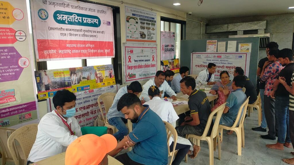 अहमदनगर (दि.४ ऑगस्ट):-महाराष्ट्र राज्य एड्स प्रतिबंध व नियंत्रण संस्था,जिल्हा एड्स प्रतिबंध व नियंत्रण विभाग जिल्हा रुग्णालय अहमदनगर स्नेहालय संपूर्ण सुरक्षा केंद्र अहमदनगर,एकात्मिक सल्ला व समुपदेशन तपासणी केंद्र, तसेच अमृतवाहिनी ग्रामविकास मंडळ संचालित अमृतदिप स्थलांतरित प्रकल्प,विखे पाटील मेमोरियल हॉस्पिटल यांच्या संयुक्त विद्यमाने सुपा येथील औद्योगिक वसाहतीमध्ये आयोजित आरोग्य तपासणी शिबिरात एकूण १५९ ते २०० रुग्णांची मोफत तपासणी व मोफत उपचार देण्यात आले.यावेळी डॉ.विनय अग्रवाल,डॉ.धनेश मुंडणकर,डॉ.सुरेश घोलप,सविता बेल्हेकर,विकास वाळुंज समुपदेशक,दिनेश लोंढे,रूपाली देशमुख प्रयोगशाळा तंत्रज्ञ, विलास भुजबळ,अंजली सावडेकर क्षयरोग नियंत्रण कार्यक्रम,सागर विटकर प्रकल्प व्यवस्थापक अमृतदिप प्रकल्प,प्रसाद माळी,मच्छिंद्र दूधवडे क्षेत्रीय अधिकारी, सागर फुलारी प्रकल्प व्यवस्थापक संपूर्ण सुरक्षा केंद्र, वैशाली कुलकर्णी,अरबाज शेख क्षेत्रीय अधिकारी आदी जण उपस्थित होते.शिबिरा वेळी व्यक्तींशी बोलताना सविता बेल्हेकर,विकास वाळुंज समुपदेशक यांनी एच. आय.व्ही बाबत लोकांना वैयक्तिक माहिती सांगितली. तपासणी का करावी एच.आय.व्ही.ची स्थिती जाणून घेणे गरजेचे आहे याविषयी प्रत्येक व्यक्तीला माहिती दिली.डॉ. सुरेश घोलप डॉ.विनय अग्रवाल डॉ.धनेश मुंडनकर यांनी आरोग्य,आहार,व्यायाम यावर मार्गदर्शन करून व्यक्तीने निरोगी राहायचे असेल तर आहार,व्यायाम नित्य नियमाने करणे गरजेचे आहे यावर लोकांना माहिती सांगितली.सागर विटकर अमृतदिप स्थलांतरित प्रकल्प,प्रकल्प व्यवस्थापक, प्रसाद माळी मच्छिंद्र दूधवडे,यांनी स्थलांतरित कामगारांवर कार्य करत असलेला स्थलांतर प्रकल्प यावर माहिती सांगून स्थलांतर करत असलेल्या प्रत्येक कामगाराने आपली रक्ताची तपासणी करणे गरजेचे आहे.दर तीन महिन्याला रक्ताची तपासणी करून घेणे आरोग्यासाठी महत्त्वाचे आहे. यावर मार्गदर्शन केले.सागर फुलारी प्रकल्प व्यवस्थापक, वैशाली कुलकर्णी,अरबाज शेख यांनी संपूर्ण सुरक्षा केंद्र मार्फत पुरवल्या जाणाऱ्या सेवा सुविधा याबद्दल माहिती देत एच.आय.व्ही मुक्त राहणे करता समुपदेशन व मार्गदर्शन आरोग्यविषयक विषय योजनांची माहिती व गरजेनुसार विविध सेवा केंद्र संदर्भ सेवा दिल्या जातात तसेच त्वचारोग, गुप्तरोग इत्यादी तपासणी करणे गरजेचे आहे संपूर्ण सुरक्षा केंद्र हे अति जोखीम वर्तन करत असलेल्या परंतु त्यांना एचआयव्ही व गुप्तरोगाचा धोका असू शकतो अशा रुग्णांनी काळजी घेणे गरजेचे आहे यावर माहिती सांगितली.विलास भुजबळ,अंजली सावडेकर क्षयरोग नियंत्रण कार्यक्रम क्षयरोग कसा पसरतो. क्षयरोग हा एका व्यक्तीकडून दुसऱ्या व