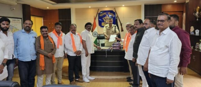 अहमदनगर(दि.७ ऑगस्ट):-महाराष्ट्राचे आराध्य दैवत छत्रपती शिवाजी महाराजांबद्दल आक्षेपार्ह वक्तव्य करणाऱ्या अरमान नईम शेख ऊर्फ टिल्लू वर देशद्रोहाचा गुन्हा दाखल करावा अशी मागणी शिवसेना व भाजपाच्या पदाधिकाऱ्यांनी जिल्हा पोलीस अधीक्षकांकडे निवेदनाद्वारे केली आहे.सोशल मिडीयावर संभाषण करताना छत्रपती शिवाजी महाराजांबद्दल अत्यंत हीन व खालच्या पातळीचे वक्तव्य आरोपी अरमान नईम शेख याने केलेले आहे.छत्रपती शिवाजी महाराज हे अखंड हिंदुस्तानचे दैवत असून त्यांच्या सारखा राजा जगात कुठलाही नाही. छत्रपती शिवाजी महाराजांबददल अशा प्रकारचे हिन व निंदनीय व खालच्या प्रकारचे वक्तव्य करणे अत्यंत चुकीचे आहे.आरोपीवर देशद्रोहाचा गुन्हा दाखल करावा तसेच अशा प्रकारचे वक्तव्य करण्यास प्रोत्साहन देणाऱ्याचा पोलीसांनी शोध लावावा व कडक कारवाई करावी अशी मागणी जिल्हा पोलीस अधीक्षकांकडे निवेदनाद्वारे करण्यात आली.यावेळी शिवसेनेचे जिल्हाप्रमुख अनिल शिंदे, शहरप्रमुख दिलीप सातपुते, बाबुशेट टायरवाले,जिल्हा संपर्कप्रमुख सचिन जाधव,भाजपाचे शहर जिल्हाध्यक्ष अँड.अभय आगरकर,संग्राम शेळके,महेश लोंढे,सागर गायकवाड,सुनिल लालबोंद्रे,भारत कांडेकर,काका शेळके, पोपटराव पाथरे,अनिकेत कराळे,मयुर गायकवाड,ओम भिंगारदिवे,शुभम कुलकर्णी,पांडुरंग घोरपडे,दामोदर भालसिंग आदी उपस्थित होते.