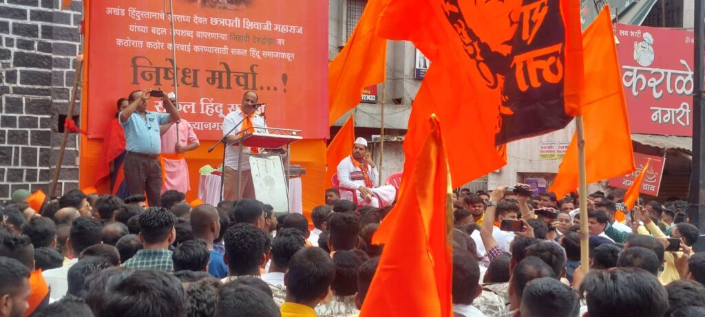 या मोर्चात हजारोंच्या संख्येने समाजबांधव उपस्थित होते.छत्रपती शिवाजी महाराज यांच्या बाबत सोशल मीडियावर एक आक्षेपार्ह ऑडिओ क्लिप शनिवारी व्हायरल झाली.या घटनेच्या निषेधार्थ नगर शहरातून सकल हिंदू समाजाच्या वतीने आज भव्य असा मोर्चा काढण्यात आला.नगर शहरातील बस स्टँड येथील छत्रपती शिवाजी महाराज यांच्या अश्वारुढ पुतळ्यास अभिवादन करून सकल हिंदू समाजाच्या मोर्चास सुरुवात करण्यात आली.या मोर्चामध्ये तरुण वयोवृद्ध व महिला वर्गाचा मोठ्या प्रमाणात सहभाग दिसून आला.हा मोर्चा माळीवाडा,पंचपीर चावडी, माणिक चौक,कापडबाजार, चितळे रोडमार्गे दिल्लीगेट येथे येऊन या मोर्चाचे विराट सभेत रूपांतर होऊन मोर्चाचा समारोप करण्यात आला.