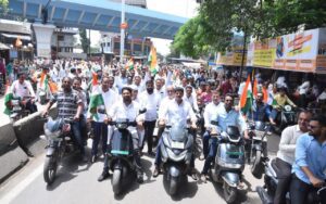या रॅलीस तरुण -तरुणींनी दाखविलेला उत्साह हा खरोखरीच कौतुकास्पद असून ज्या ज्या वेळी देशाचे पंतप्रधान नरेंद्र मोदीजी हे नवनवीन संकल्प करतील तेव्हा तेव्हा तरुण – तरुणींनी असेच सहकार्य करावे असे आवाहन खा.डॉ.सुजय विखे पाटील यांनी केले.भारतीय स्वातंत्र्य दिनाच्या पार्श्वभूमीवर “हर घर तिरंगा” अभियानाच्या माध्यमातून आज अहमदनगर शहरात मोठ्या दिमाखात मोटार सायकल रॅली काढण्यात आली. यावेळी भारत माता की जय, असा जय घोषात करण्यात आला. भारतीय स्वातंत्र्य दिनाच्या पूर्वंसंध्येला आयोजित या रॅलीच्या सांगता समारोप प्रसंगी ते बोलत होते. यावेळी बोलताना ते म्हणाले की स्वातंत्र्याच्या अमृत महोत्सवाची सांगता 15 ऑगस्ट रोजी होत असून या अमृत कालखंडात देशाने केलेली प्रगती ही अवर्णीय अशीच असून देशाचे नेते नरेंद्र मोदी हे आता विश्वाचे नेते झाले आहेत. महासत्ता असलेले राष्ट्र हे मोदीजी यांना पाठिंबा देत आहेत. देश आता आर्थिक प्रगतीच्या दिशेने वाटचाल करत असून येणाऱ्या कालखंडात भारतीय अर्थव्यवस्था ही तीन नंबरची होईल असा आशावाद या वेळी व्यक्त केला.याप्रसंगी जिल्हा बँकेचे अध्यक्ष श्री शिवाजीराव कर्डिले, भाजपा जिल्हाध्यक्ष श्री दिलीप भालसिंग, शहराध्यक्ष श्री अभयतात्या आगरकर, माजी महापौर श्री बाबासाहेब वाकळे, श्री महेंद्र गंधे, श्री अक्षय कर्डिले ,श्री सुरेंद्र गांधी, श्री धंनजय जाधव, माजी जिल्हाध्यक्ष अरुण मुंडे, यांची प्रमुख उपस्थिती होती.या रॅलीची सुरुवात मार्केट कमिटी येथील छत्रपती शिवाजी महाराज व डॉ.बाबासाहेब आंबेडकर यांच्या पुतळ्यास पुष्पहार घालून वंदन करून झाली. माणिक चौक येथे स्वातंत्र सेनानी सेनापती बापट व कारंजा चौक येथील स्वातंत्रवीर सावरकर यांच्या पुतळ्यास पुष्पहार घालून अभिवादन देखील करण्यात आले.न्यू आर्टस् कॉलेज येथे हुतात्मा करवीर चौथे यांच्या पुतळ्यास पुष्पहार घालून वंदन करुन बाईक रॅली ची सांगता करण्यात आली.या रॅलीत नगरसेवक, भाजप पदाधिकारी, तरुण -तरुणी,नागरिक मोठ्या संख्येने उपस्थित होते.