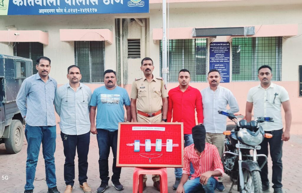 पोलीस निरीक्षक चंद्रशेखर यादव यांना दुचाकीवरून येत असलेल्या तीन जणांवर संशय आल्याने त्यांनी तिघांना अडवून झडती घेतली असता चोरीतील एक दुचाकी व चार मोबाईल मिळून आले. आरोपींना विश्वासात घेऊन सखोल चौकशी केली असता पुणे जिल्ह्यातील रांजणगाव शिरूर आणि भीमा कोरेगाव परिसरात चार मोबाईल नागरिक रस्त्यावरून बोलत जात असताना जबरदस्तीने हिसकावल्याची कबुली त्यांनी दिली. चोरीतील हा मुद्देमाल विक्री करण्यासाठी बीड येथे घेऊन जात असल्याची कबुली ताब्यात घेतलेल्या तिघांनी दिली आहे. चोरी केलेली दुचाकी व चार मोबाईल असा ९० हजार रुपये किमतीचा मुद्देमाल जप्त करण्यात आला आहे. पोलीस अधिक्षक राकेश ओला, अपर पोलीस अधिक्षक प्रशांत खैरे, उपविभागीय पोलीस अधिकारी अनिल कातकाडे यांच्या मार्गदर्शनाखाली पोलीस निरीक्षक चंद्रशेखर यादव, पोलीस उपनिरीक्षक शितल मुगडे पोलीस अंमलदार योगेश भिंगारदिवे, तनवीर शेख, गणेश धोत्रे, राम हंडाळ, सतीश भांड, गणेश ढोबळे, विजय गावडे, संतोष बनकर, अर्जुन फुंदे, अब्दुलकादर इनामदार, सलीम शेख, संदिप थोरात, अमोल गाढे, सुजय हिवाळे, कैलास शिरसाठ, सोमनाथ राऊत, सागर मिसाळ, अतुल काजळे यांच्या पथकाने ही कारवाई केली.