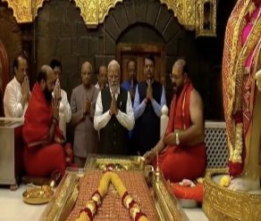 अहमदनगर (दि.२६ ऑक्टोबर):-भारताचे पंतप्रधान नरेंद्र मोदी हे आज शिर्डी दौऱ्यावर आहेत.यावेळी पंतप्रधान नरेंद्र मोदी यांनी श्री.साईबाबा समाधी मंदिरात दर्शन घेऊन पूजा व आरती केली.मंदिरात राज्यपाल रमेश बैस,मुख्यमंत्री एकनाथ शिंदे, उपमुख्यमंत्री देवेंद्र फडणवीस, उपमुख्यमंत्री अजित पवार, महसूलमंत्री राधाकृष्ण विखे पाटील,भाजप प्रदेशाध्यक्ष चंद्रशेखर बावनकुळे यांच्यासह अन्य नेतेमंडळी उपस्थित होते.