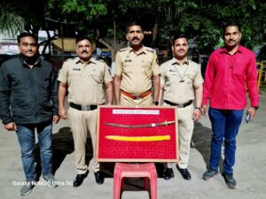 त्यानंतर गेटजवळ जाऊन पाहिले असता पोलिसांना त्या ठिकाणी एक पिवळ्या रंगाची त्याला केशरी रंगाची कडा असलेली म्यान व त्याच्या आतमध्ये टोकदार लोखंडी तलवार निदर्शनास आली.तलवार घेऊन फिरणाऱ्या इसमाचे नाव विचारले असता सीताराम श्रीराम खताळ वय-४८ (रा.सावेडी अहमदनगर) असे सांगण्यात आले.