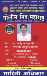संगमनेर (दि.२१ डिसेंबर):-अहमदनगर जिल्ह्यातील संगमनेर तालुक्यातील चिंचोली गुरव येथील सामाजिक कार्यकर्ते तथा CG NEWS चे संपादक श्री.राजेंद्र मेढे यांची युवा क्रांती फाउंडेशन अंतर्गत पोलीस मित्र, ग्राहक व पत्रकार संरक्षण आणि माहिती अधिकार संघटना, पोलीस मित्र महाराष्ट्र संघटनेच्या संगमनेर तालुका सदस्य पदी नुकतीच निवड झाली आहे.