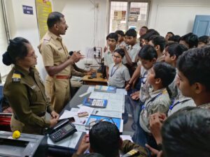 पोलीस ठण्यात असणारे शस्त्र व इतर साहित्य दाखवुन त्या बाबत सविस्तर माहीती देण्यात आली.विदयार्थांना रस्ता वाहतुकीचे नियम ,महिला सक्तीकरण ,सायबर गुन्हे याबाबतही सविस्तर विश्लेषण करुन विदयार्थांना शाळेमध्ये अडचणी निर्माण होत असल्यास त्याबाबत तात्काळ संपर्क साधण्याचे करण्याचे अवाहन पोलीस निरीक्षक चंद्रशेखर यादव यांनी केले.